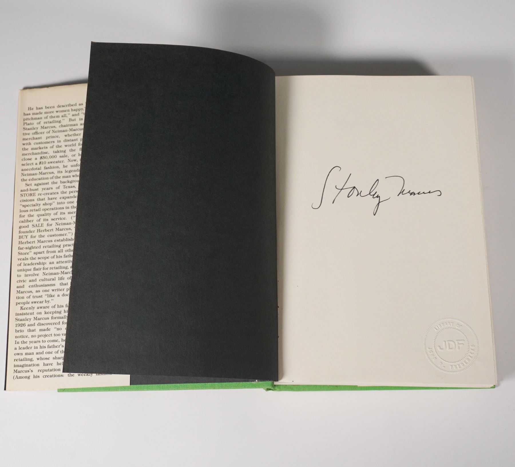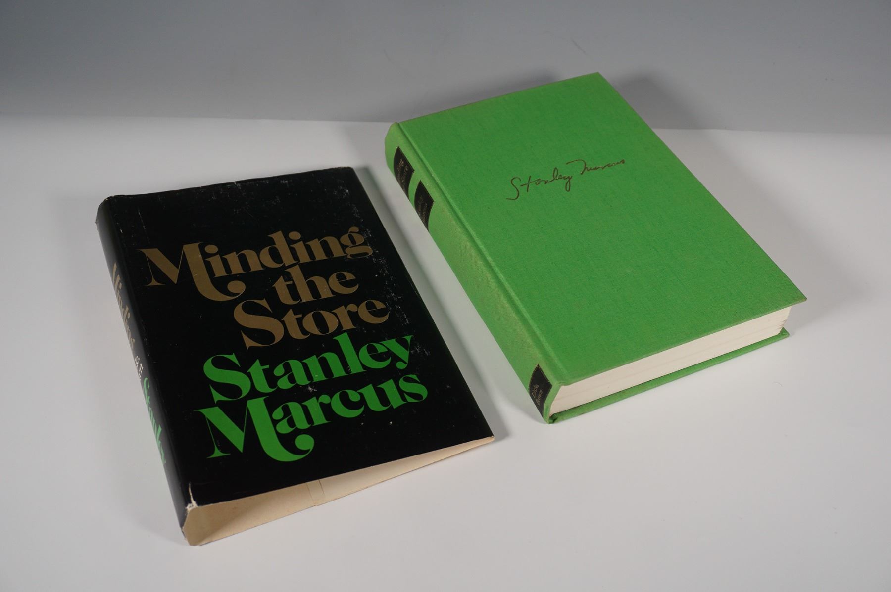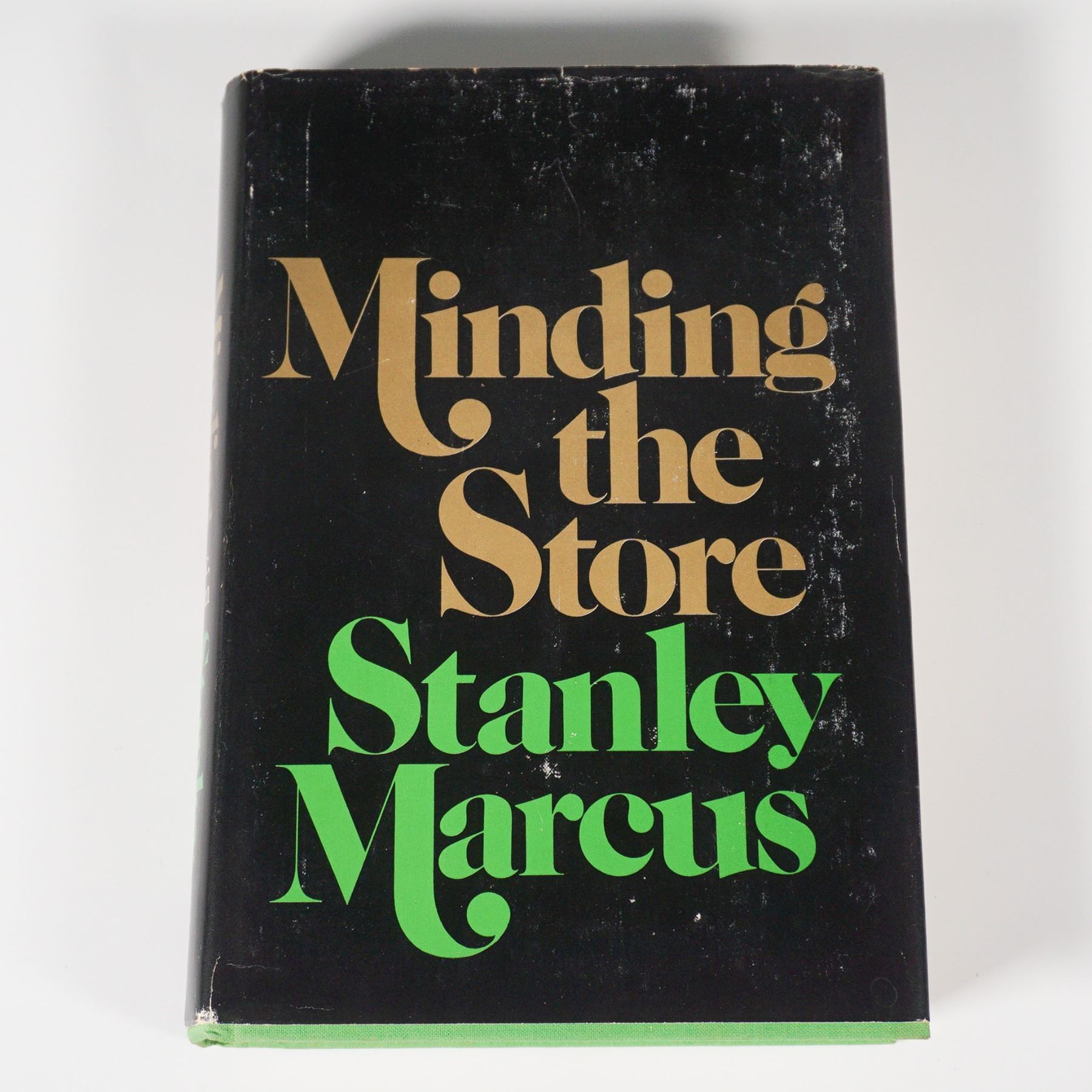 A signed by author Minding the Store by Stanley Marcus, published in 1974 by Little, Brown and Company. In this memoir, Stanley Marcus, the legendary retailer and former CEO of Neiman Marcus, provides an insider's perspective on the retail industry, customer service, and business leadership. This copy is personally signed by the author on the front endpaper and bears an embossed seal from the John D. Fredericks library collection. The book retains its original black dust jacket with gold and green typography, showing signs of wear consistent with age. The interior pages remain clean and bright, making this a desirable copy for collectors of business history and retail industry literature.