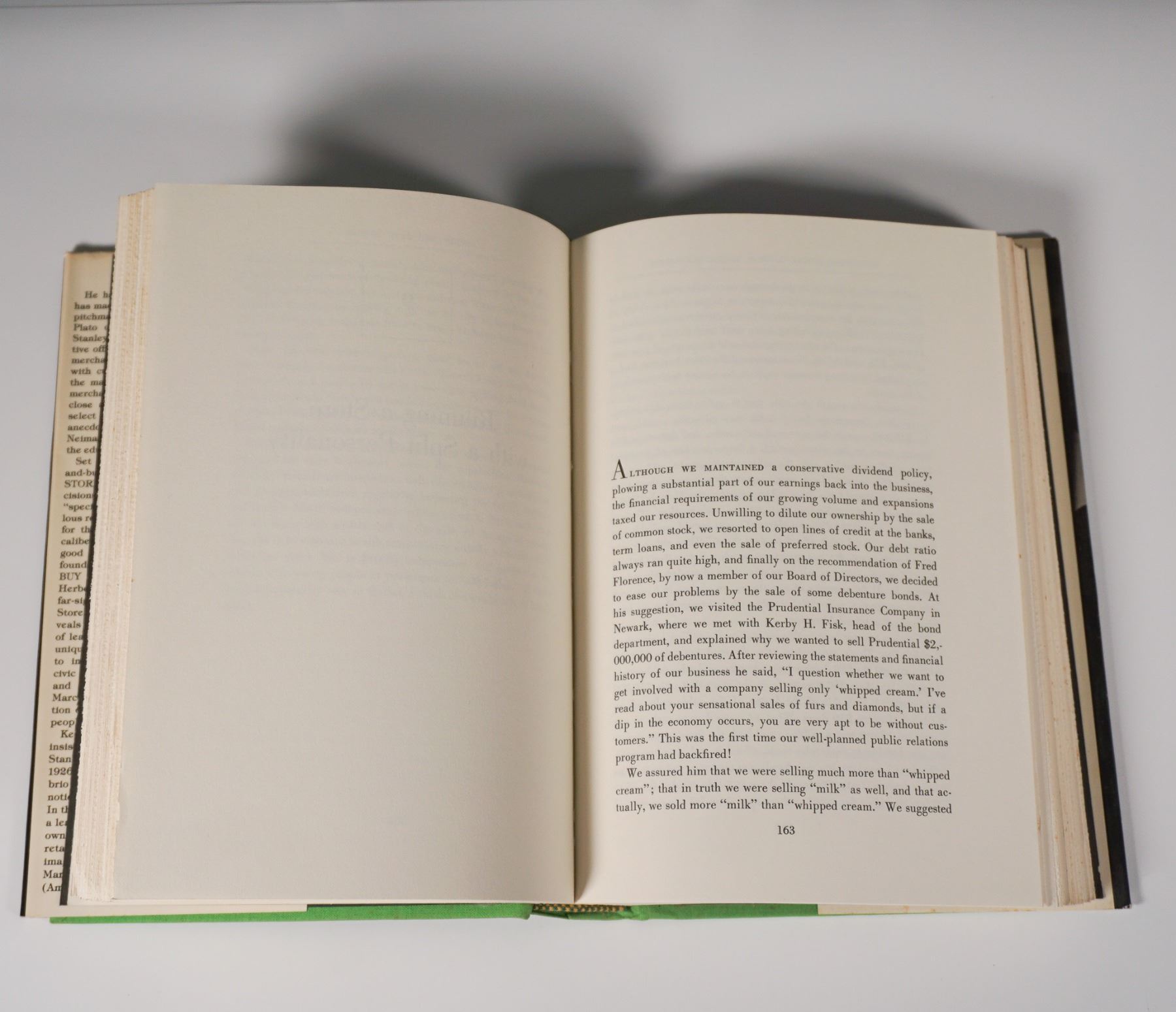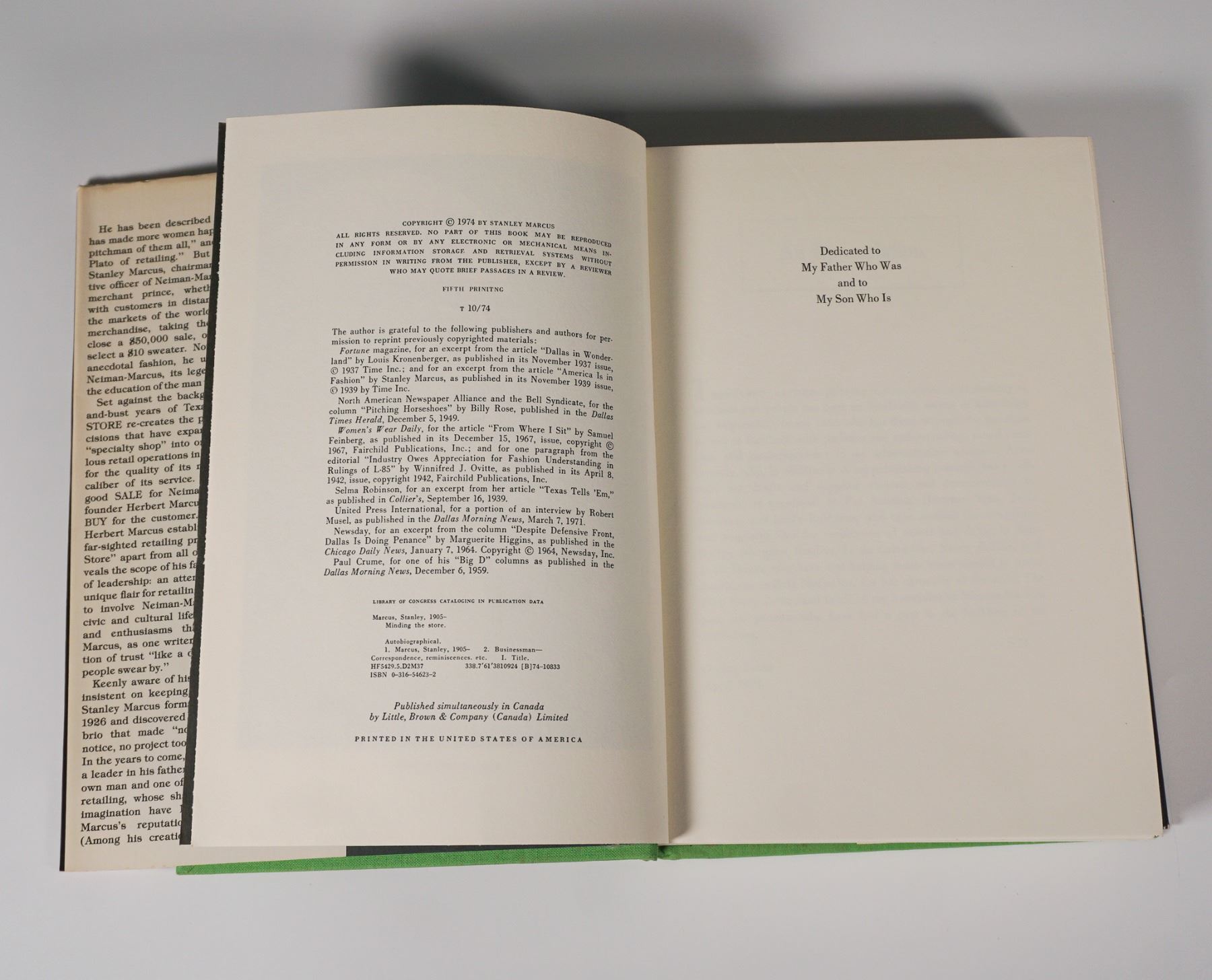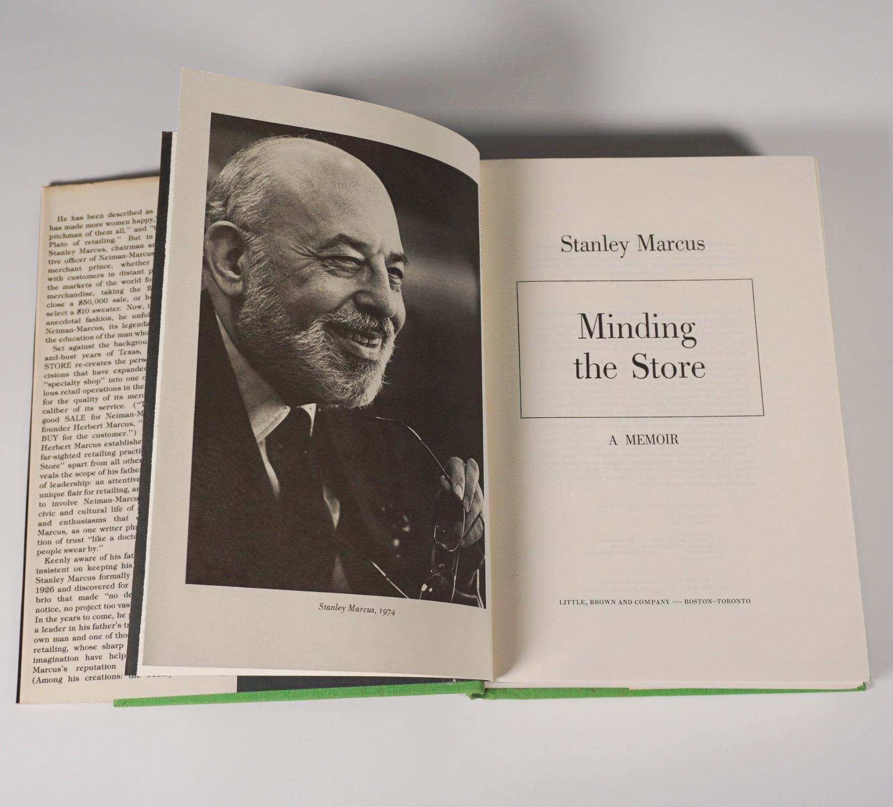 A signed by author Minding the Store by Stanley Marcus, published in 1974 by Little, Brown and Company. In this memoir, Stanley Marcus, the legendary retailer and former CEO of Neiman Marcus, provides an insider's perspective on the retail industry, customer service, and business leadership. This copy is personally signed by the author on the front endpaper and bears an embossed seal from the John D. Fredericks library collection. The book retains its original black dust jacket with gold and green typography, showing signs of wear consistent with age. The interior pages remain clean and bright, making this a desirable copy for collectors of business history and retail industry literature.