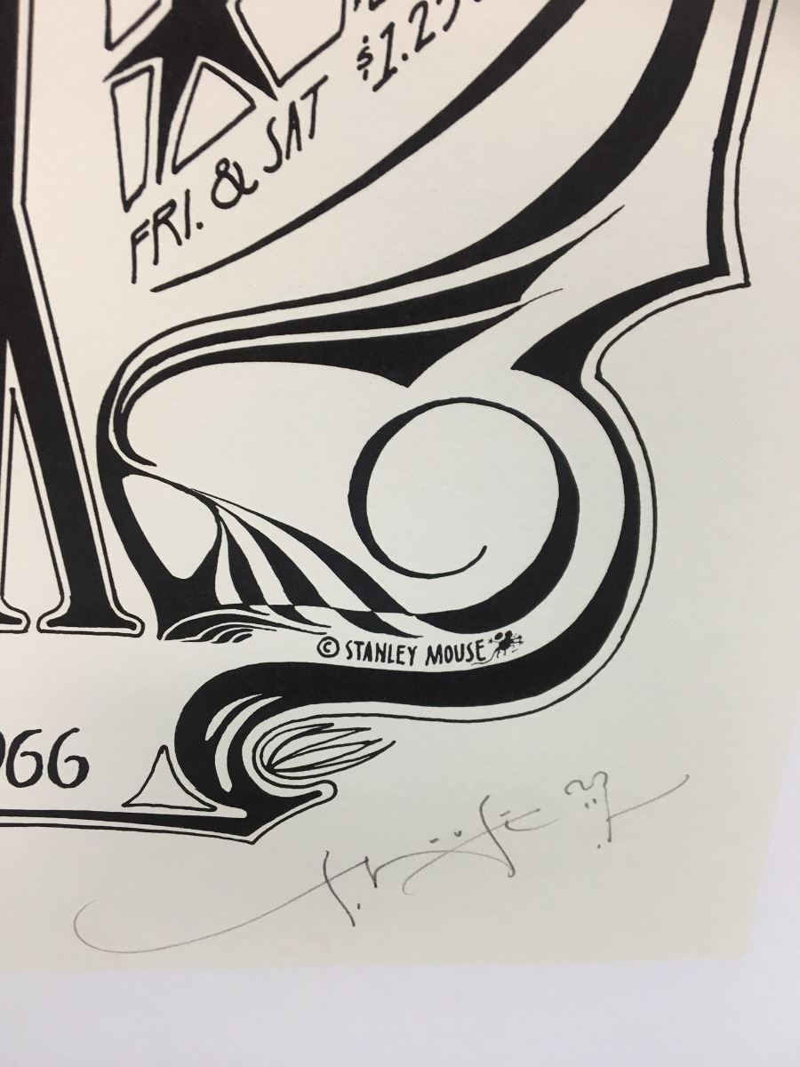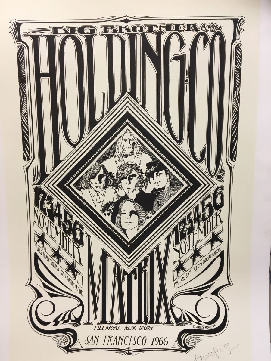 Best known for his 1960’s era Fillmore West concert posters – for the Grateful Dead , The Doors , and other Bill Graham superstar Rock n Roll acts -- Stanley Mouse signed and numbered these limited edition fine art lithograph reproductions of his famous designs. The original advertising posters , if you can find one and pry it from its owner’s hands , would sell for $10,000 or more. These fine reproductions are produced on acid-free art paper in editions of 350 plus proofs, Total edition of 385 This “Matrix” poster reproduction commemorates a concert by the great Janis Joplin with Big Brother and the Holding Company . Paper size is 44x31” with an image of 39.5 x 26.5”. pencil signed .