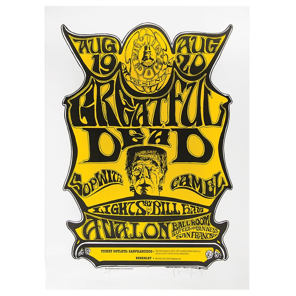 Limited edition color 27 x 37.75 lithograph of an early Family Dog (FD-22) concert poster designed by Alton Kelley and Stanley Mouse for a pair of Grateful Dead concerts at the Avalon Ballroom in San Francisco, California, on August 19 and 20, 1966. The lithograph, numbered 372/500, features a large yellow and black design with a central image of Frankenstein’s monster and bold, fluid lettering that misspells the band’s as “Greatful Dead.” This poster design was the first that Mouse Studios did for the Grateful Dead, hence the spelling mistake. Signed in the lower border in pencil by the two artists. Rolled and in fine condition.