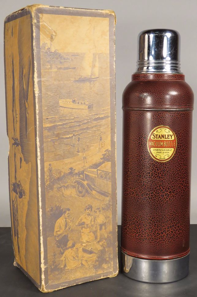 Stanley One Quart Red Vacuum Bottle in original gift box. Excellent family/picnic graphics. Box shows age, bottle good condition.