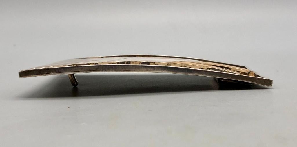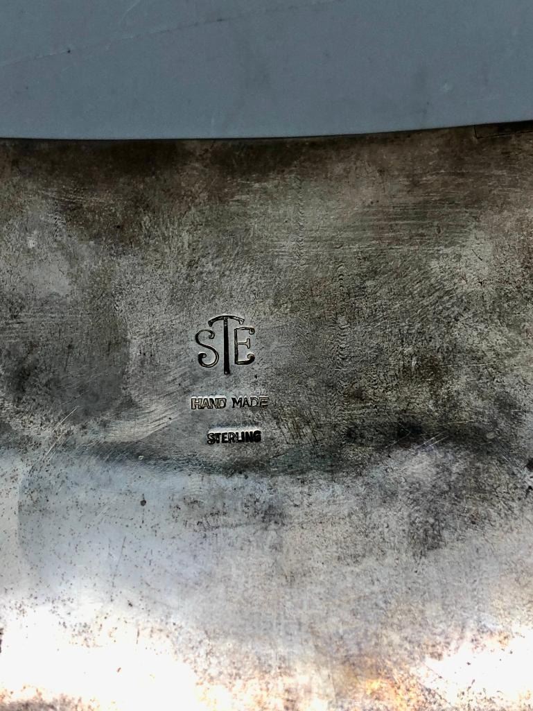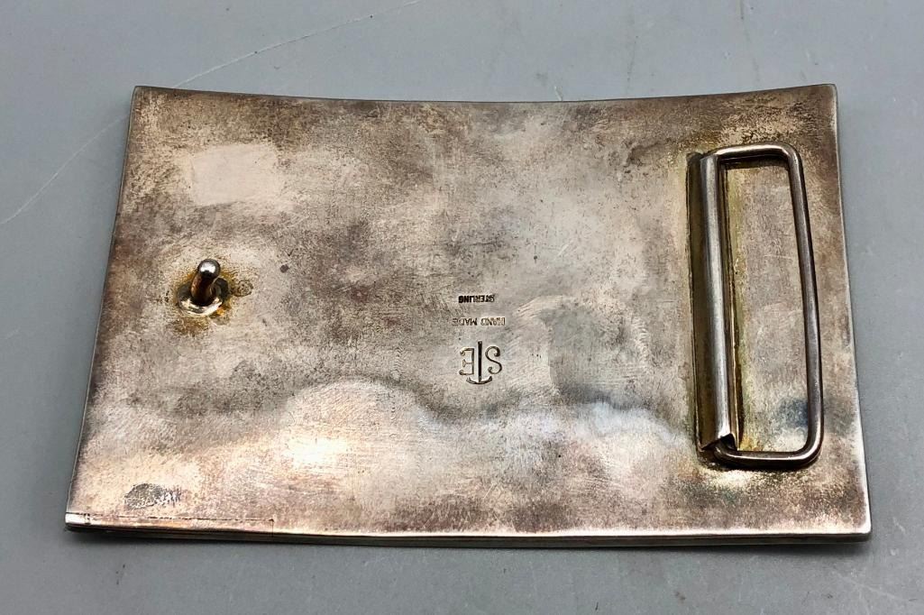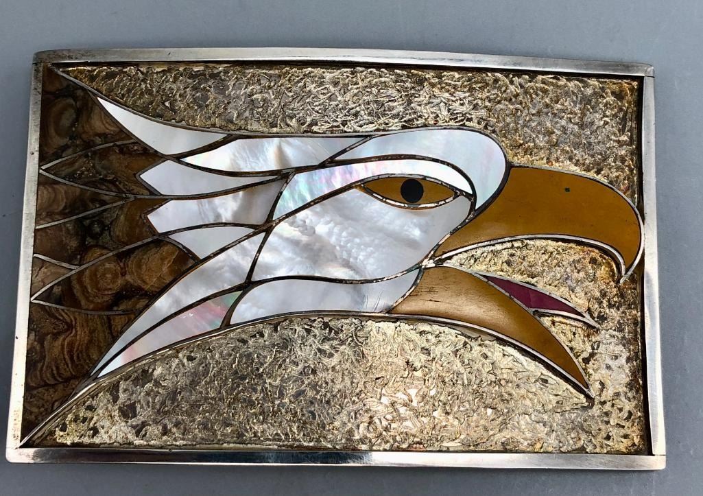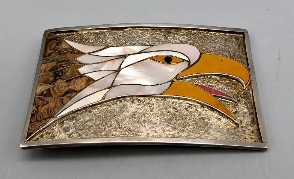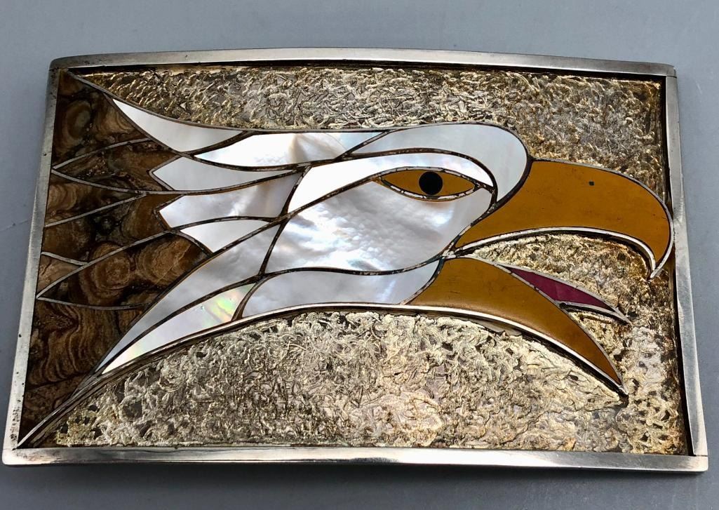 Presented for sale in this lot is a Stanley Tims inlay belt buckle. This is a nice "statement" buckle featuring an eagle head. It is set with various shells and has fine silverwork in between the settings which are smooth and flush. The background is textured, accenting the inlay work wonderfully. It is stamped as sterling. MAKER: Hallmarked STE, handmade. Stanley Tims (Anglo). APPROX AGE: Vintage. SIZE: 4-1/4 inches wide X 2-3/4 inches tall. Fits a 1-5/8 inch belt. Weighs 107.4 grams. CONDITION: Good for its age, normal wear expected. Please look closely at the pictures as they are an important part of our description and are hereby incorporated into the description, specifically with regards to condition. SHIPPING: There will be a $5 handling / packaging fee for shipping this lot. The actual cost of postage will be added on top of that. BUY IT NOW: If you would like to buy this item now, without waiting for the auction day to bid on it, we do offer this option (which is available up to 48 hours before the actual auction starts). The “Buy it Now†price is the high estimate of this lot (plus applicable fees and the Buyer's premium is discounted to 10% when using the Buy it Now option). If you would like to exercise this option, you must contact us by email (or phone as long as you talk to someone live). Reference this lot number and your intention to "Buy it Now."