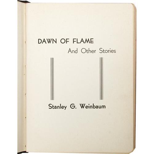 <B>Stanley Weinbaum:<I> Dawn of Flame and Other Stories.</B></I></B></I> (Jamaica: Rupert Printing Service (Milwaukee Fictioneers), 1936), first edition of 250 bound copies, black fabrikoid covers with gilt titles, 8vo (5.75" x 8"), fine condition. This is the edition with the Lawrence Keating introduction. <I>From the Ventura Collection.</B></I><BR><BR><b>Shipping:</b> Books & Catalogs (<a target="_blank" href="http://www.heritageauctions.com/common/shipping.php">view shipping information</a>)