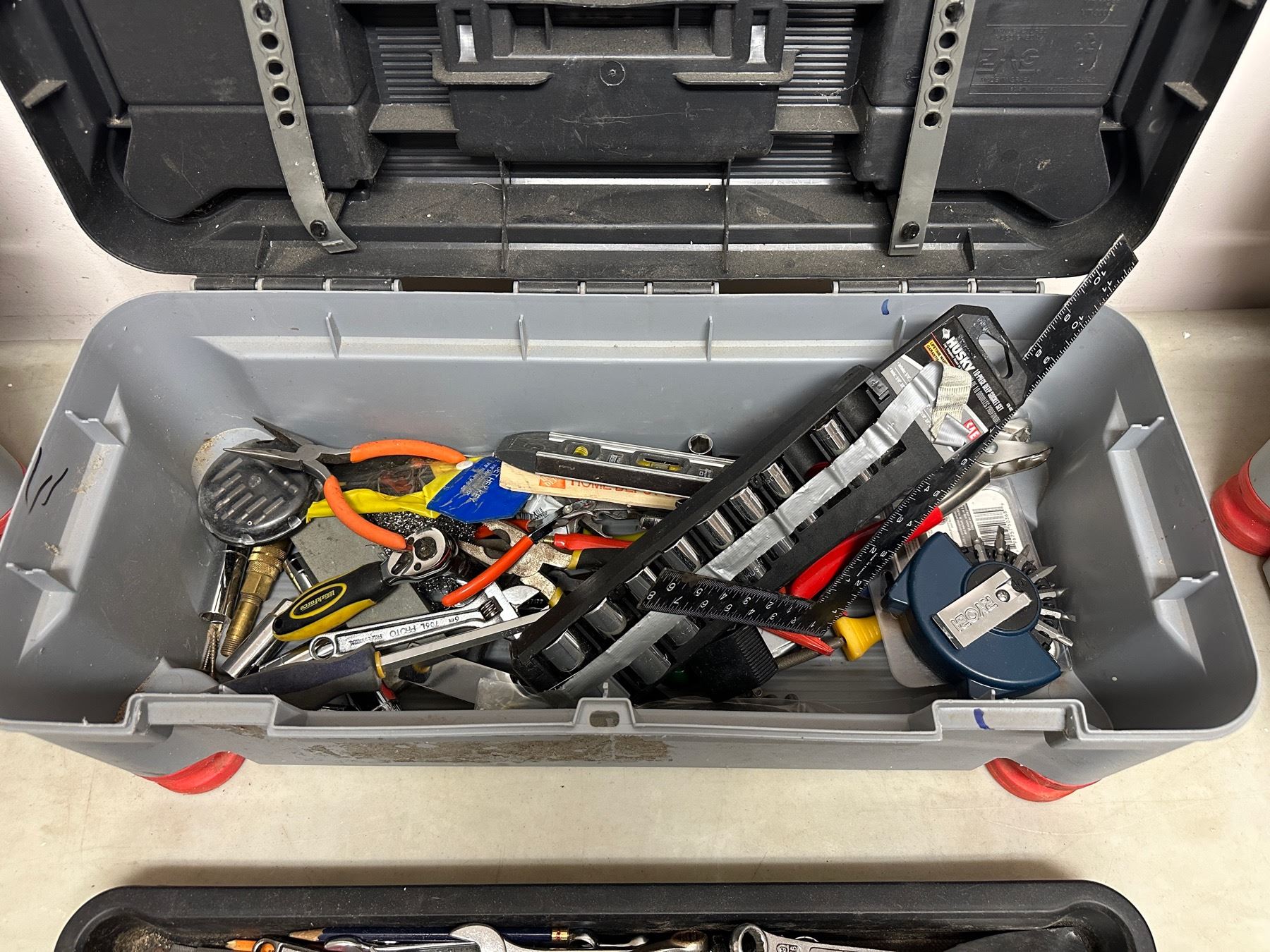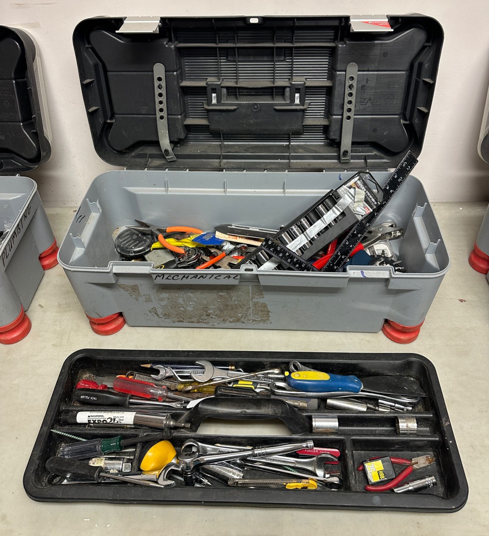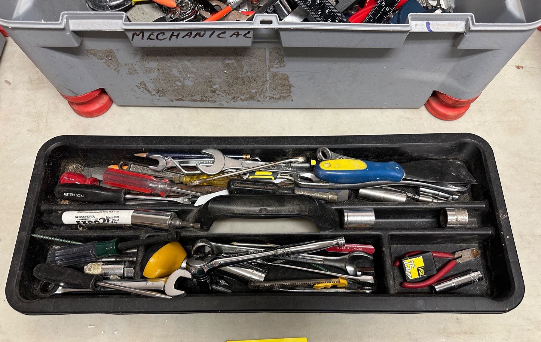 Stanley toolbox full of assorted mechanical & misc - includes wrenches / pliers / screwdrivers / L shaped rulers / socket set etc