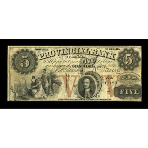 <B>Stanstead, PC- The Provincial Bank</B></I> $5 April 1, 1856 Ch. # 610-10-06<BR> This short lived bank packed enough drama into its seven years of operation as most banks do into seven decades. Organized in 1856, notes from this bank began to circulate before the bank had even opened in Stanstead, forcing the bank's principal stockholder to direct noteholders to send their notes directly to him in Stanstead for redemption. With confidence restored, the notes became widely accepted. A few years later an application was made for a charter, which was not granted. By late 1862 the institution began to wind up its affairs by redeeming its outstanding circulation, with the notes becoming worthless three years later. No doubt this is why Charlton reports "Notes of this bank are seldom offered, and usually are found in low grades, often with tears or pieces missing. Problem free notes in middle grades are exceptional." Other than one miniscule split, this piece is flawless for its grade. Pleasing <B>Fine,</B></I> a truly rare item in this grade.<BR><I>From The Thomas M. Flynn Collection</B></I><BR><BR><b>Shipping:</b> Coins & Currency (<a target="_blank" href="http://www.heritageauctions.com/common/shipping.php">view shipping information</a>)