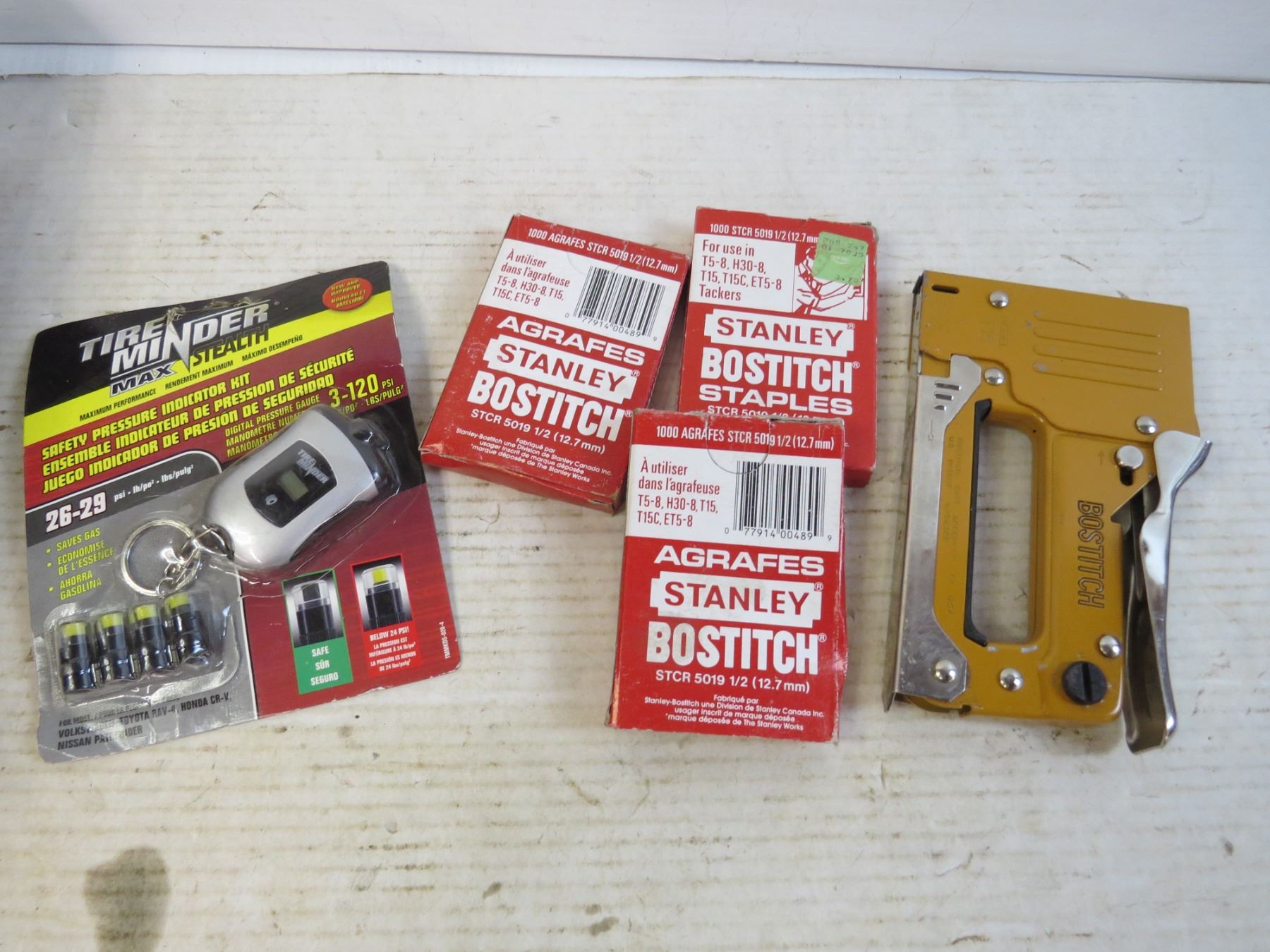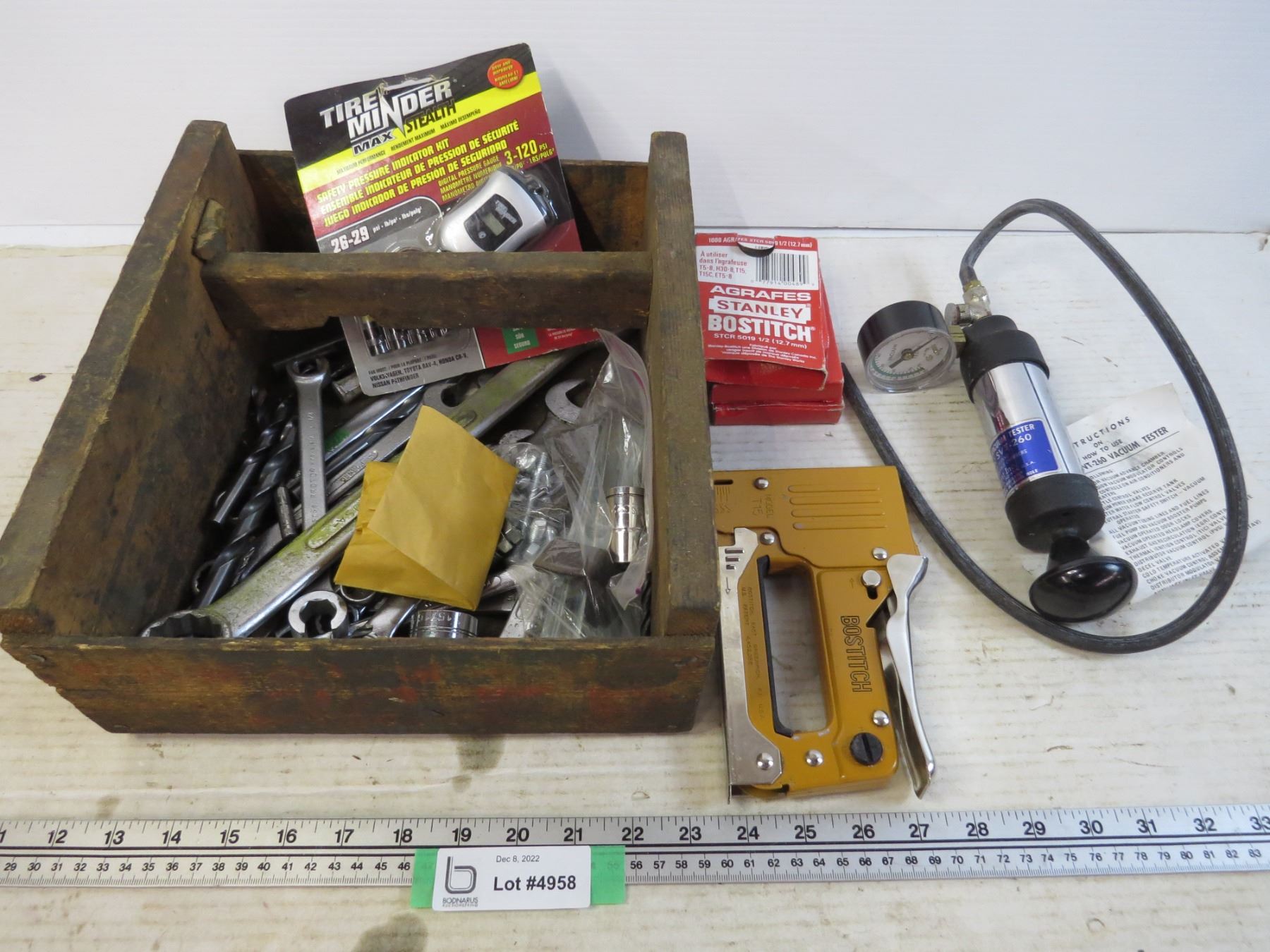 Stant Vacuum Tester - Wooden Box with Assorted Wrenches - Stapler with Staples - Tireminder