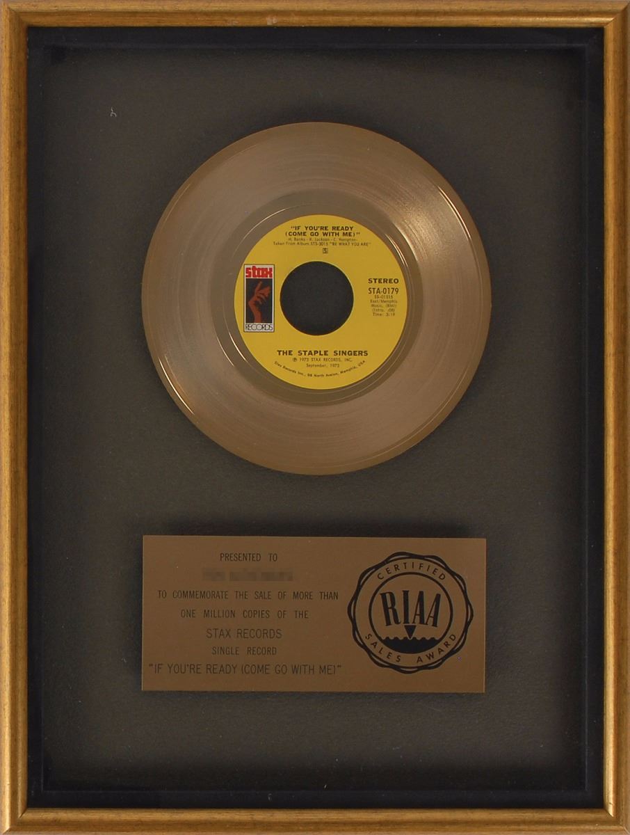 Official floater-style RIAA gold sales award presented “to commemorate the sale of more than one million copies of the Stax Records single record ‘If You’re Ready (Come Go with Me).’” Framed with its disc and plate to an overall size of 13 x 17. Award retains its original tape-repaired backing. In fine condition.