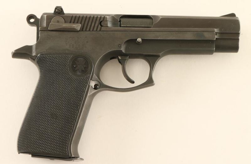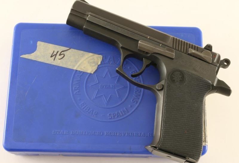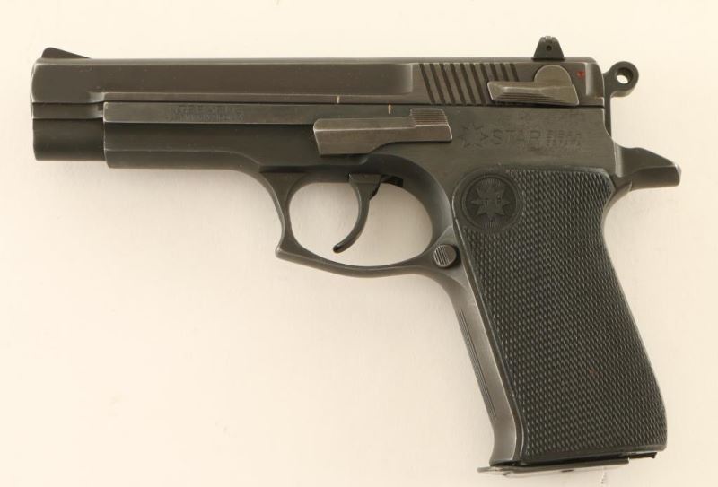 Spanish made double action semi-automatic pistol chambered in 9x19mm. Features a blued finish, 4.4" barrel, fixed ramp front sight, adjustable two-dot rear window sight, ambidextrous thumb safety, smooth trigger, serrated round hammer spur, push button magazine release, 15 round magazine, steel beavertail frame and two-piece checkered black rubber grips with Star insignias. Includes the original factory hard case. Pistol exhibits approximately 87% of it's original blued finish showing moderate holster wear and finish loss on the grip straps. Action is smooth, bore is pristine and rubber grips are very good. Condition is very good in box. ***Modern Firearm***