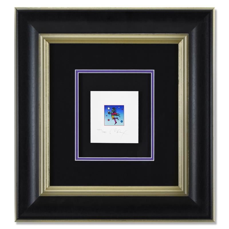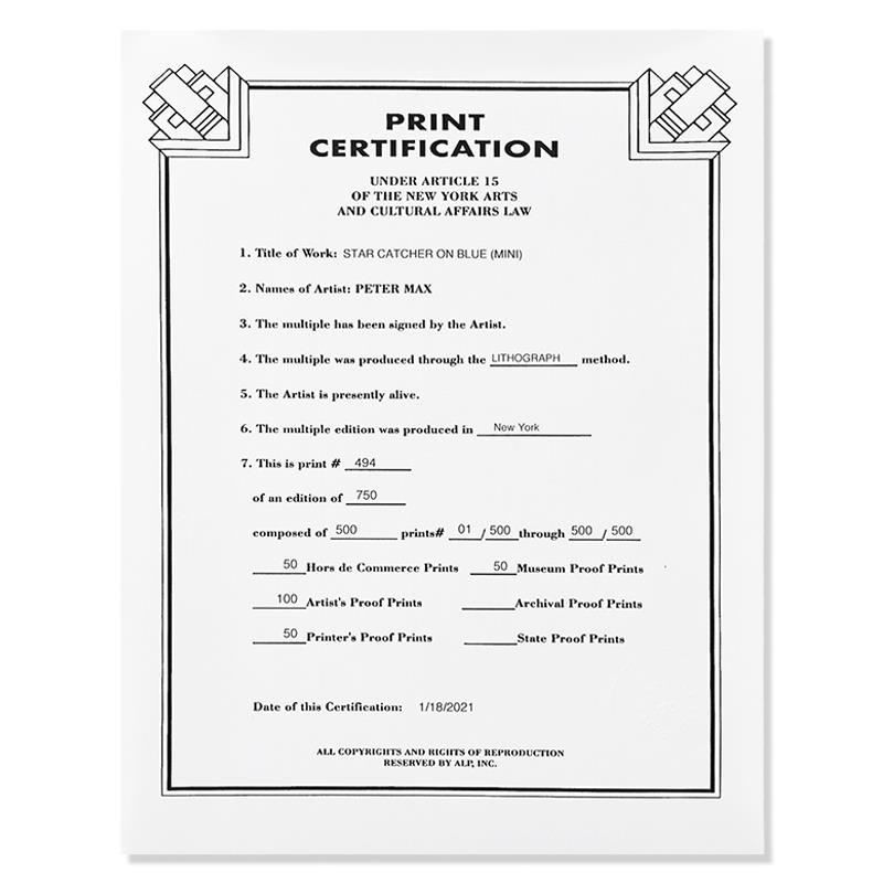 "Star Catcher on Blue" is a limited edition lithograph on paper by Peter Max, numbered 494/500 and hand signed by the artist. This piece comes framed and includes Certificate of Authenticity from Peter Max Studios. Measures approximately 20.5" x 19.5 (frame), 5" x 4.5" (image).