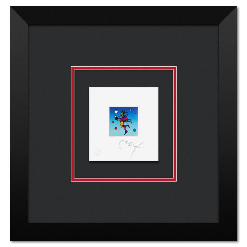 "Star Catcher on Blue," is a limited edition lithograph on paper by Peter Max, numbered and hand signed by the artist. This piece comes framed. Includes Certificate of Authenticity from Peter Max Studios. Measures approx. 14" x 14" (frame), 5" x 5" (image).