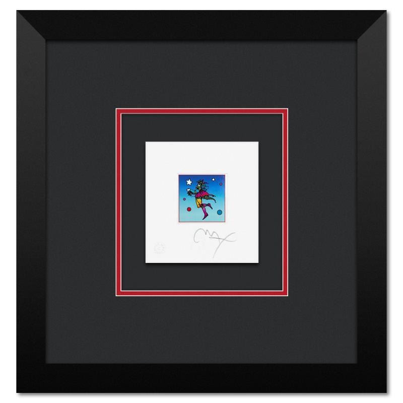 "Star Catcher on Blue" is a limited edition lithograph on paper by Peter Max numbered and hand signed by the artist. This piece comes framed. Includes Certificate of Authenticity from Peter Max Studios. Measures approx. 14" x 14" (frame) 5" x 5" (image).
