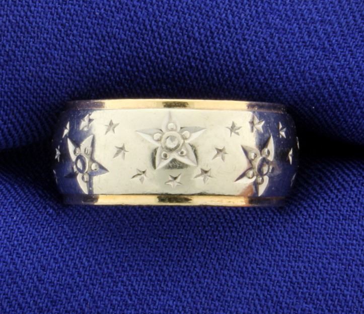 This ring is 14K white & yellow gold and has a star pattern that goes all the way around. It is 8.5mm wide and is a size 7 1/2. 8.5g