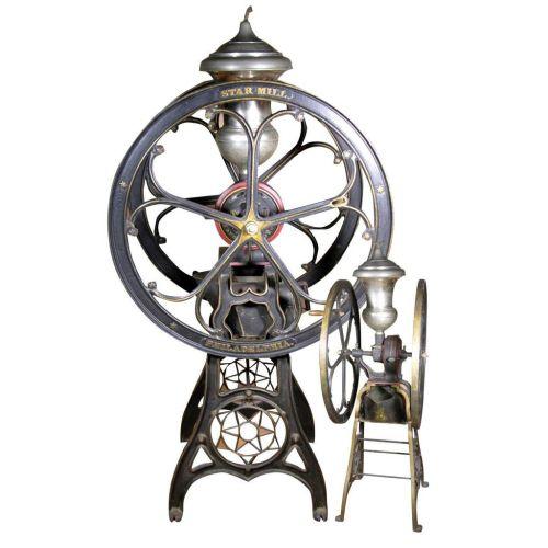 Rare Star Floor Model number 18 B Coffee Grinder , by Henry Troemner Philadelphia, PA. Original paint, stenciling, eagle finial and pan. Patent date 1885. 66 inches high with 34 inch wheel diameter.