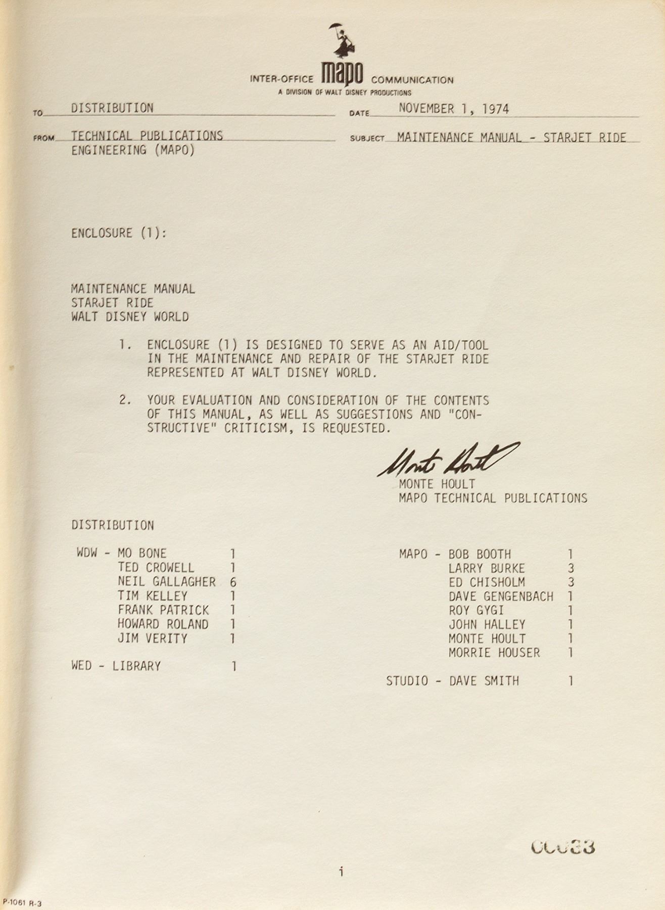 (Walt Disney World, 1974) An incredibly rare maintenance manual for the Star Jets attraction at Walt Disney World. Prepared by WED Imagineering, this comprehensive manual contains many high-quality black-and-white photos and technical diagrams for the attraction. The manual serves as an incredible archive of information on this well-remembered attraction that was a staple of Tomorrowland for 20 years. The hardcover manual measures 11.25"x8.75" and 0.75" thick, and is in good condition with some wear to the cover from use and age, including a small piece of tape applied over a crack in the top-left corner of the front cover.