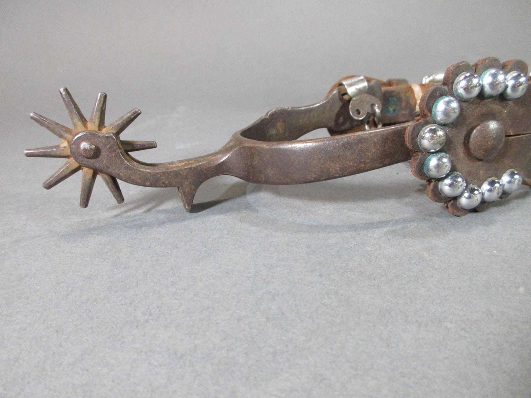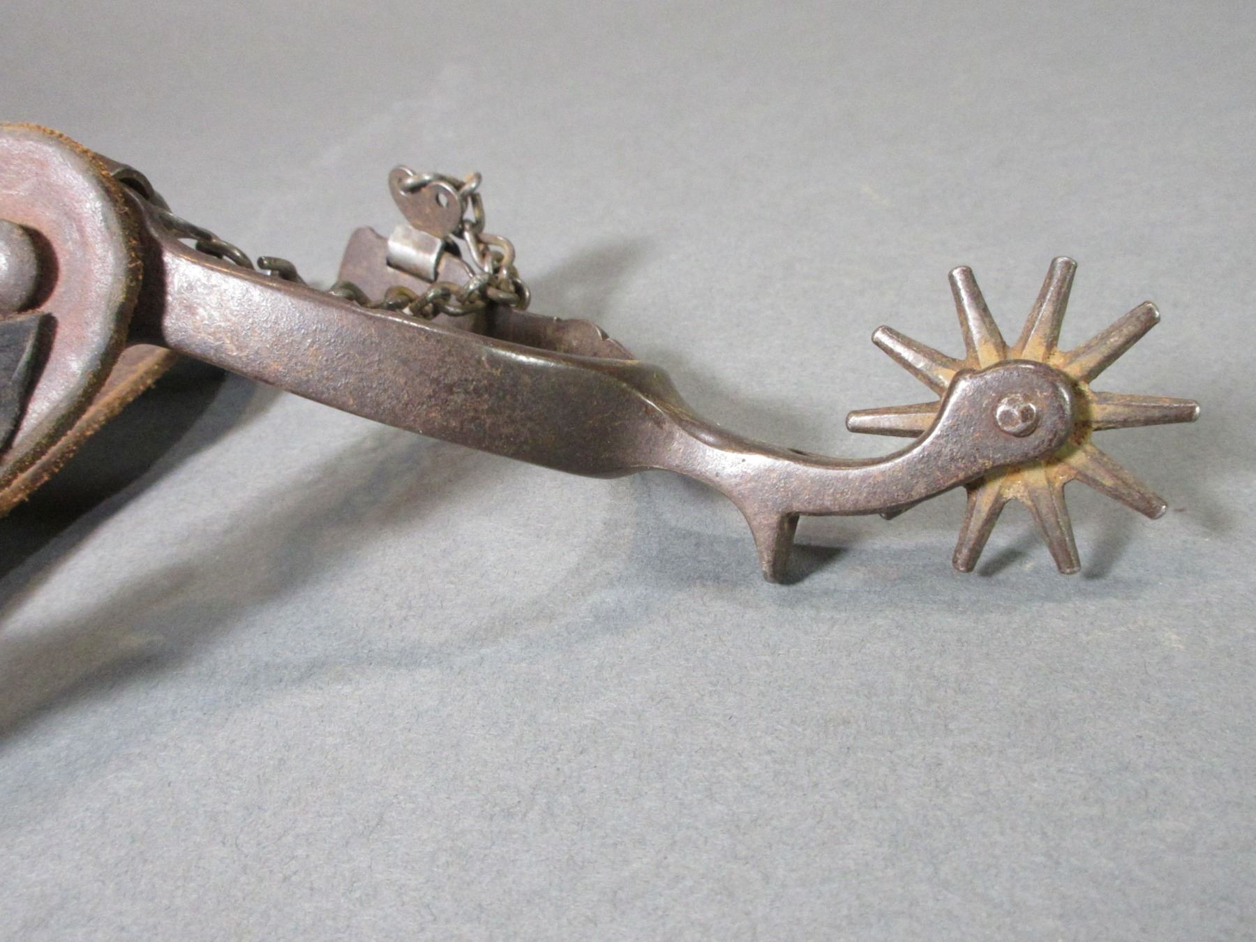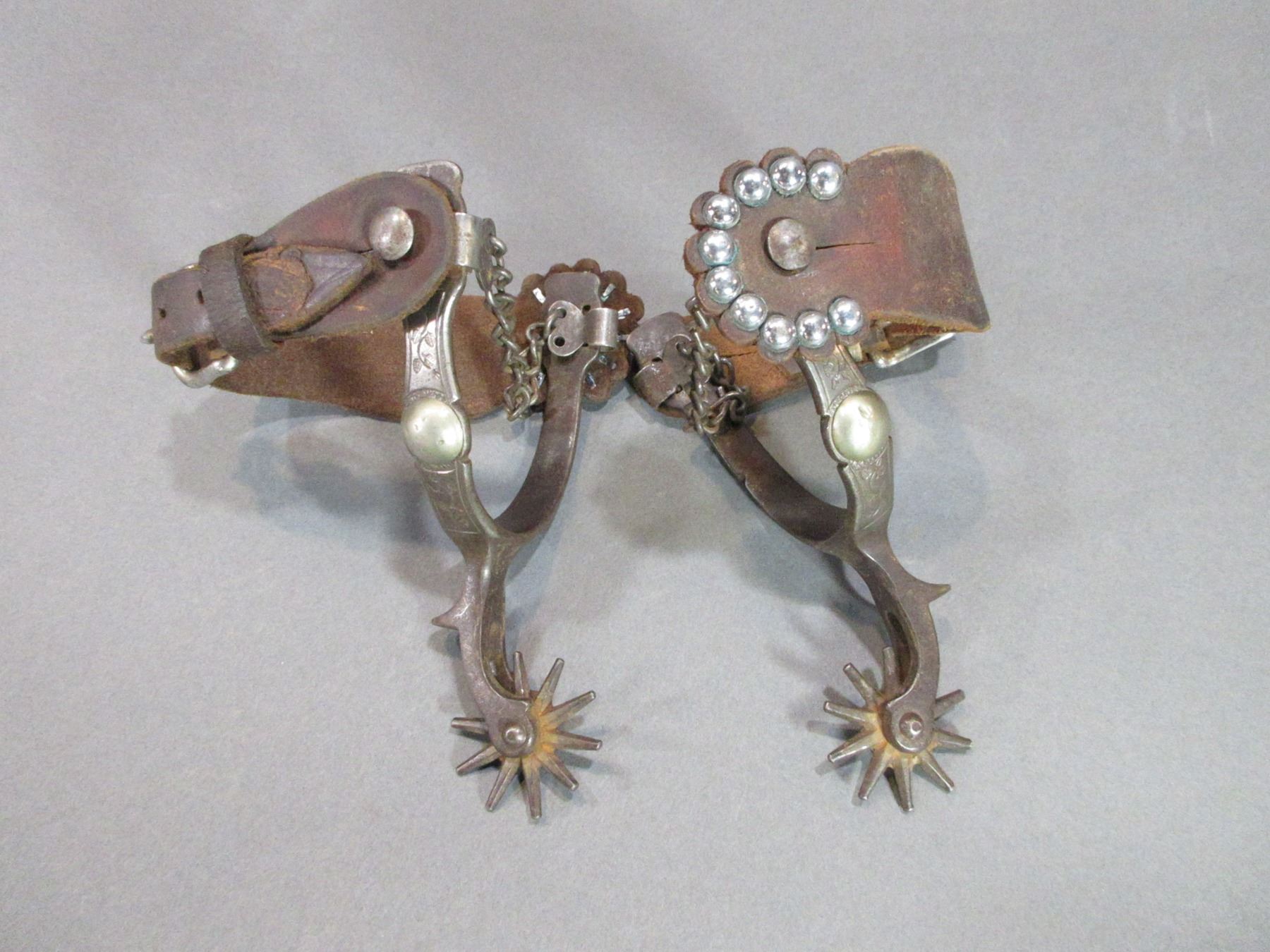 Star Marked Buermann Silver Inlaid Spurs- .75" Bands- 2" Drop Shanks- 10 Point Rowels- Chap Guards- Heel Chains- Newer Dotted Straps
