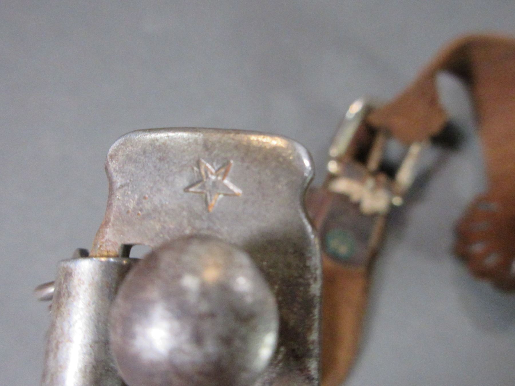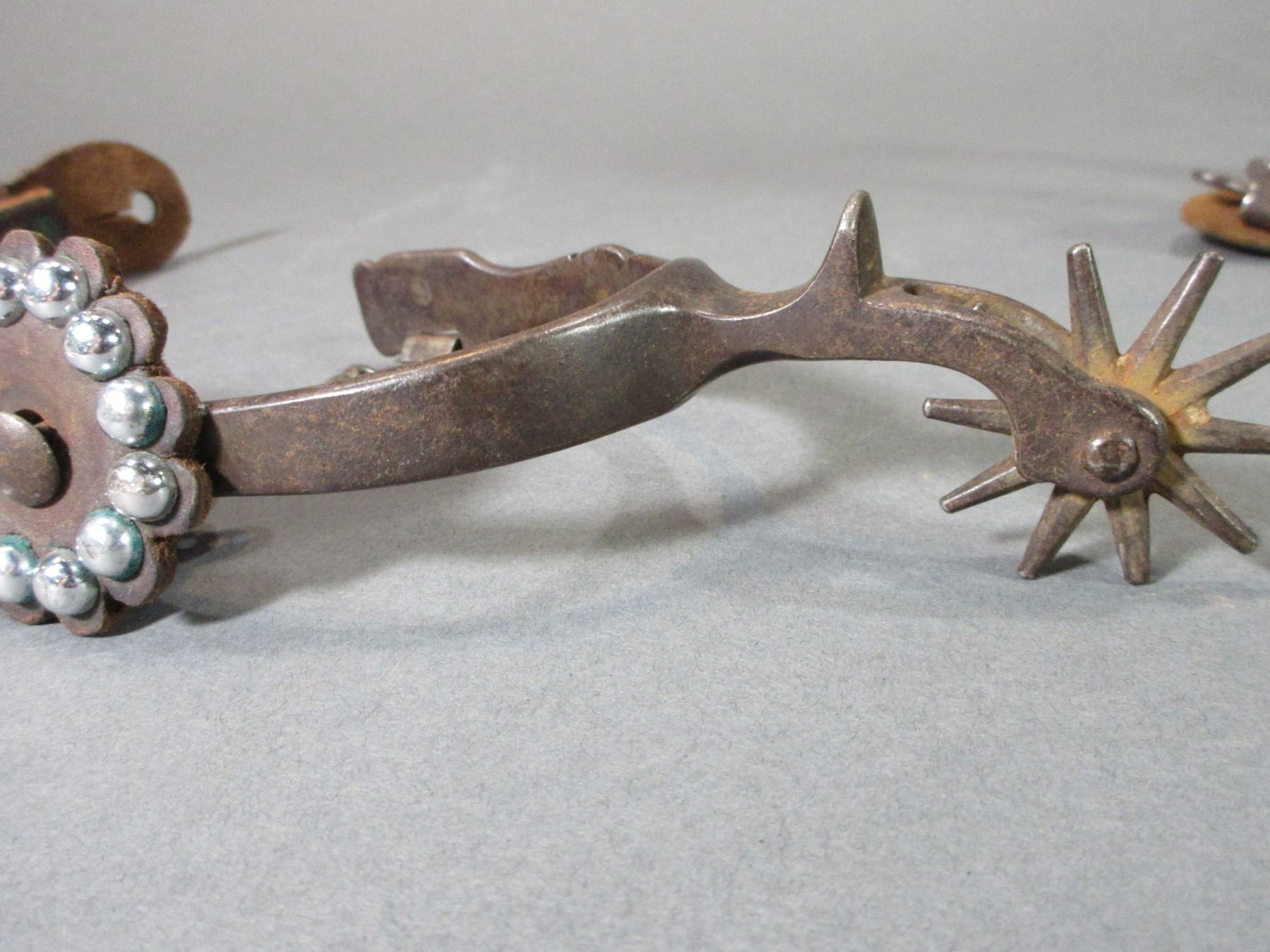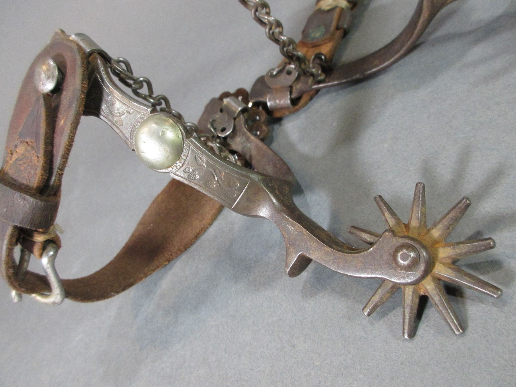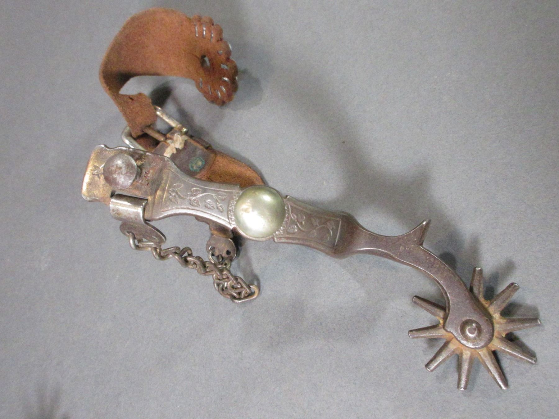 Star Marked Buermann Silver Inlaid Spurs- .75" Bands- 2" Drop Shanks- 10 Point Rowels- Chap Guards- Heel Chains- Newer Dotted Straps