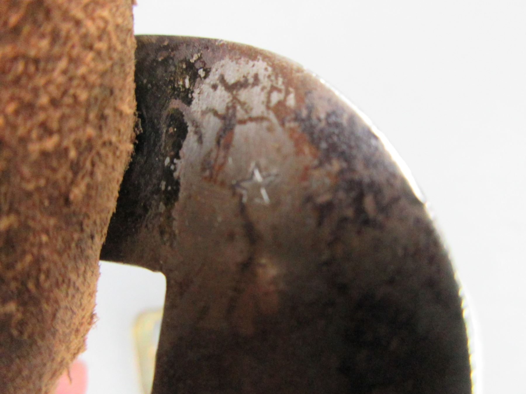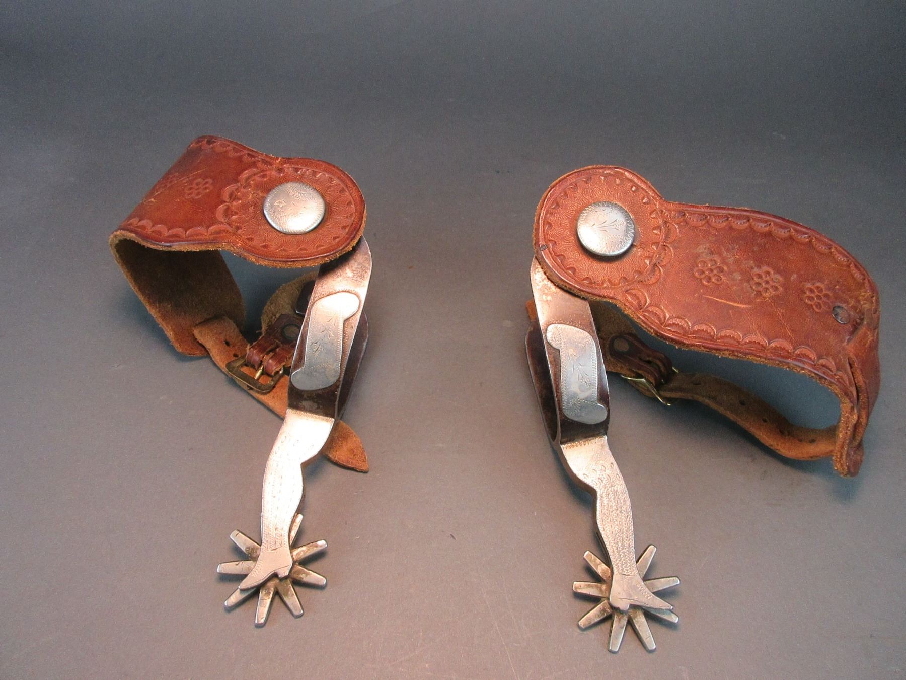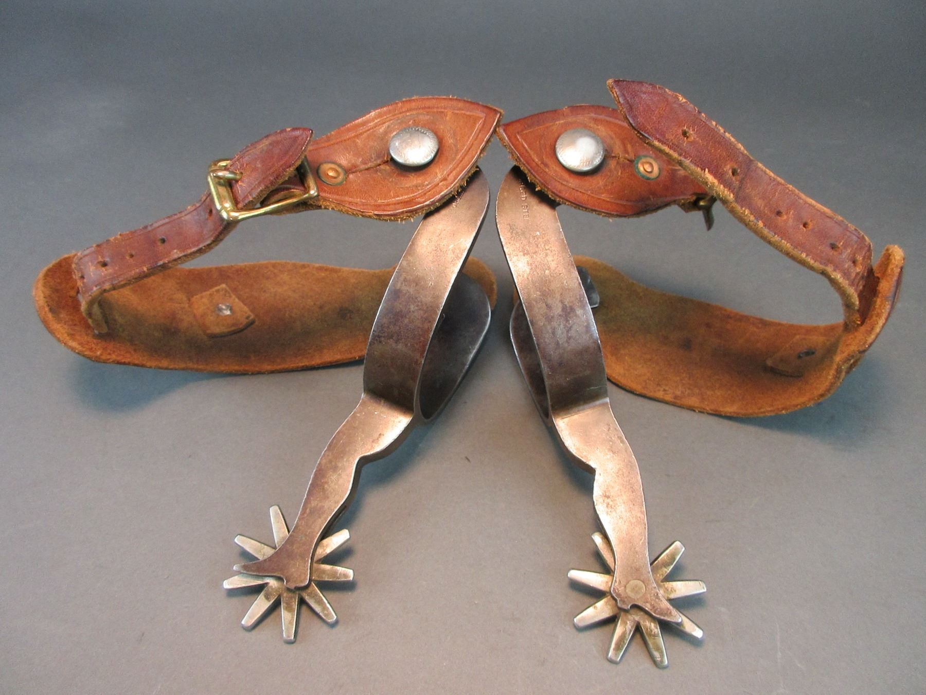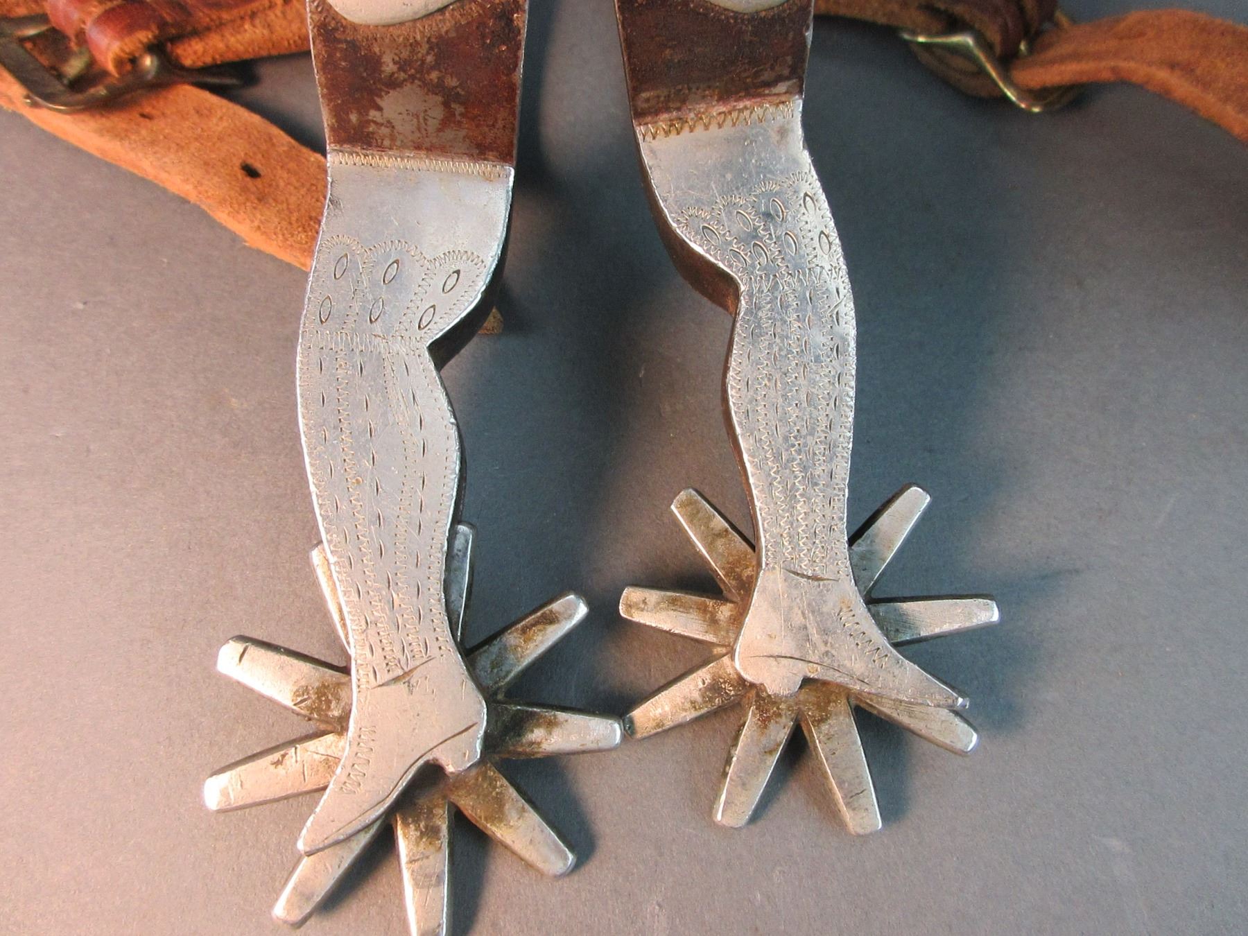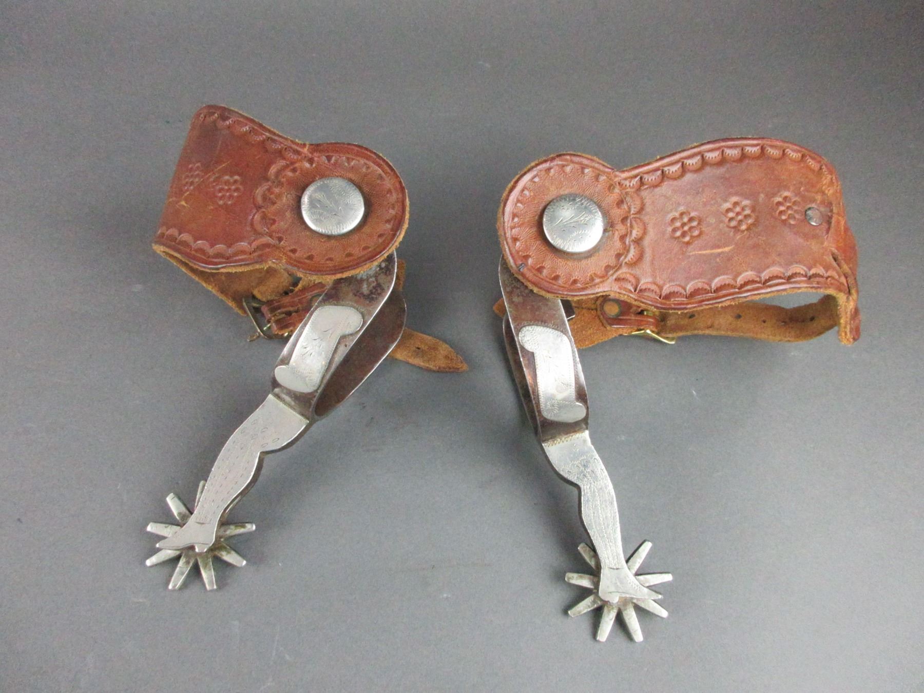 Star Marked Buermann Silver Overlaid Lady Leg Spurs- .8" Bands- 2.75" Shanks- 9 Point Rowels- Stamped Straps- Good Condition