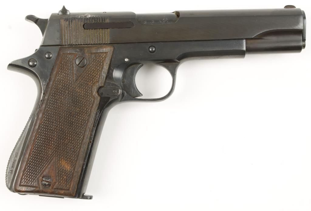 Spanish made single action semi auto 1911 style pistol with 5" barrel. Blue refinish, checkered double diamond wood grips, spur hammer, no grip safety and fixed sights. Good bore and action. Includes 1 magazine. Condition: Fair to good showing pitting under new blue around grips.