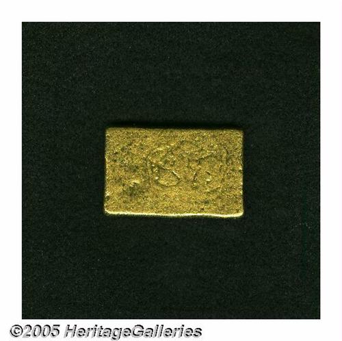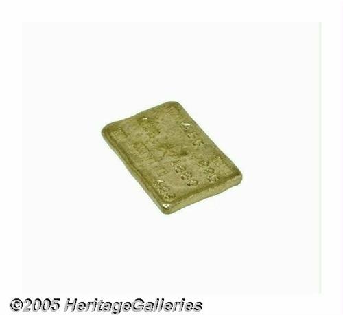 <B>Star Mining Co. Gold Transport Ingot.</B></I> According to the April 1980 NASCA catalog, which featured six Star Mining Co. ingots, there were three firms with this name in existence in 1880. The problem has been which one actually produced ingots. Like the F. G. Hoard ingot above, these ingots first surfaced in a 1969 Glendining Sale, and were found by a treasure hunter with a metal detector. While little is actually known about Star Mining Co., a great deal has been speculated. Several years ago, Fred Holabird debunked a modern forgery made with machine engraving. However, this particular piece appears to be consistent with other ingots with hand-punched devices that were used by other Western assayers. This small, rectangular ingot has the following inscriptions on three lines: OZS 4.55 FINE 995 / CAL. <S 1880 / No MINING Co 429. The star device is especially interesting as it is striated in two directions on each point with diagonals in the center. Numerous small to medium sized contact marks are peppered over each side.<BR><I>From The Alan Bingel Collection.</B></I>