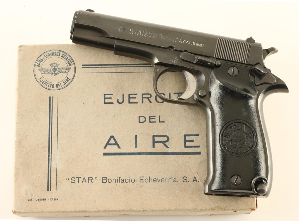 Spanish Air Force marked small frame single action semi-automatic pistol chambered in .380 auto, manufactured by Star Bonifacio Echeverria, S.A. circa 1946. manufactured 1941-1965. 6.5" overall, with a 4" barrel. Recoil-operated single-action. 8+1 capacity. Fixed blade, and notch sights. Frame mounted thumb safety. Spanish Air Force crest on right frame, and slide, with number of 8391. Blued metal , with black plastic "Star" grips. Comes in the original factory box, with Spanish Manual. No magazine. Slide action is smooth/tight. Bore is excellent/bright. Grips are good with some scratches/scuffs. Blued metal finish is about 98%, with some minor edge wear, and some minor scratches. NRA Condition-Very Good, plus. Modern Firearm. C&R Eligible.