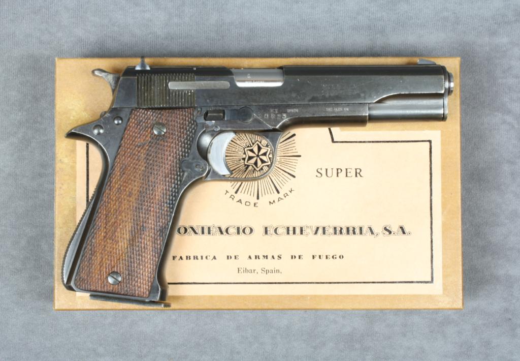 Star Model Super semi-auto pistol, import  marked with Interarms cardboard shipping box,  9mm cal., 5” barrel, blue finish, checkered  wood grips, extra magazine and instructions  manual, #10823. This gun is in overall goodcondition showing the majority of a flat  black re-finish, very good bore, action,  markings and grips.  Est.:  $150-$300.