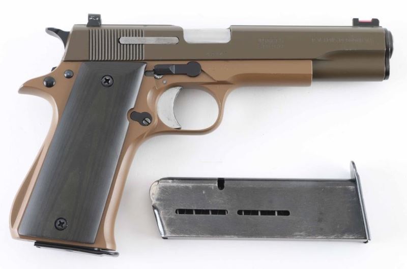 Spanish semiautomatic pistol imported by PW Arms, Redmond WA. Features two tone epoxy type finish (olive green over tan), smooth exotic wood grips, 5" barrel, dovetails in slide for sights (partridge front with fiber optic insert, two dot rear with tritium inserts), single action trigger, frame mounted manual safety, push button magazine release. Bore is very good condition. Retains 95% re-finish with few signs of use & handling, markings appear shallow & partly eroded under refinish. Grips are very good condition. Includes (2) magazines. Condition is NRA Very Good (as altered & refinished) *** Modern Firearm ***