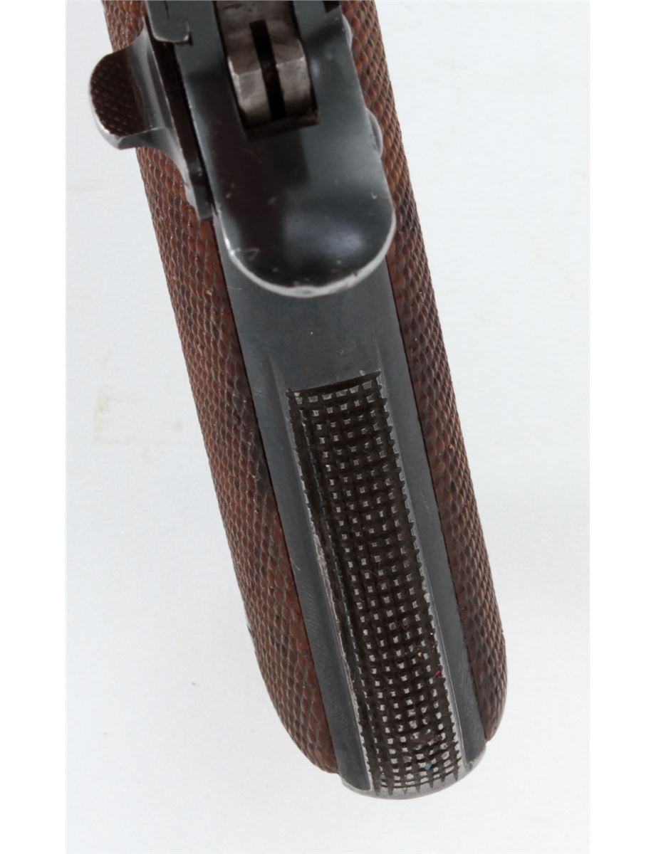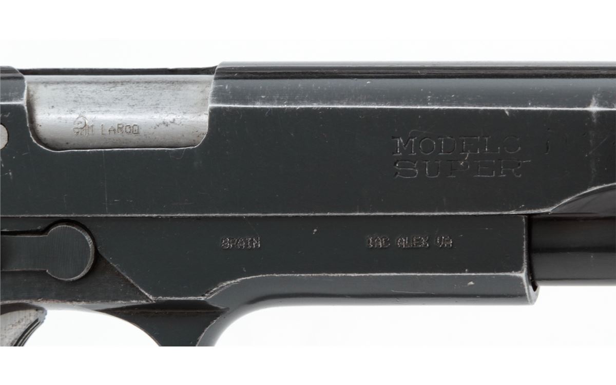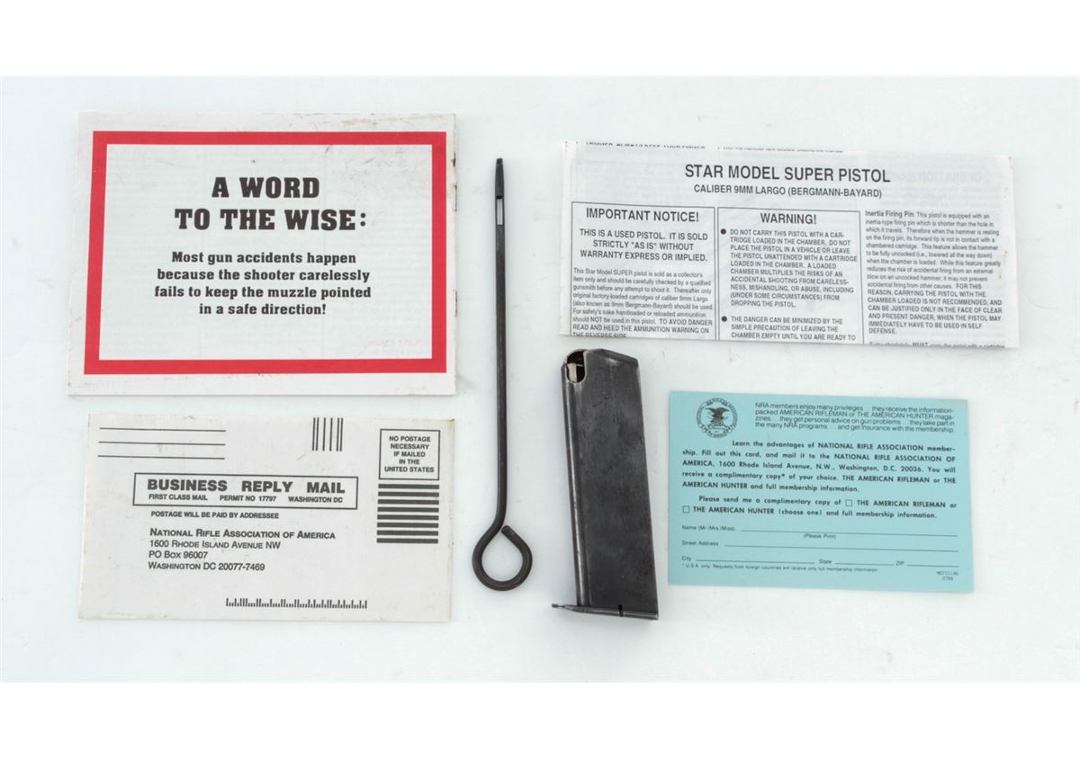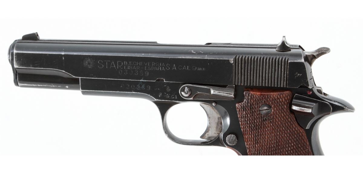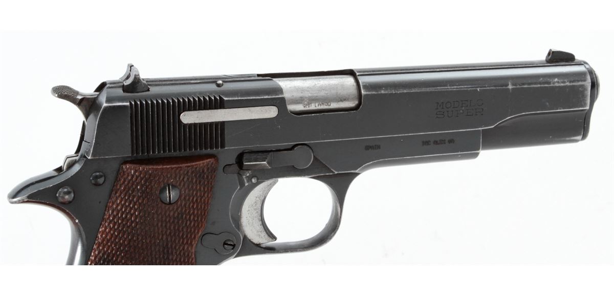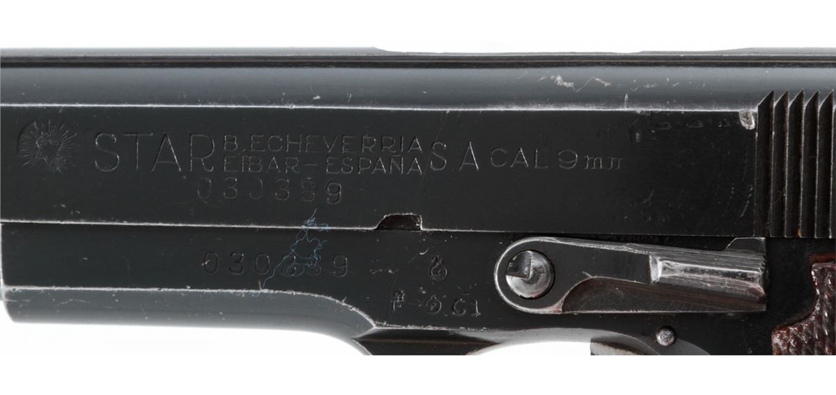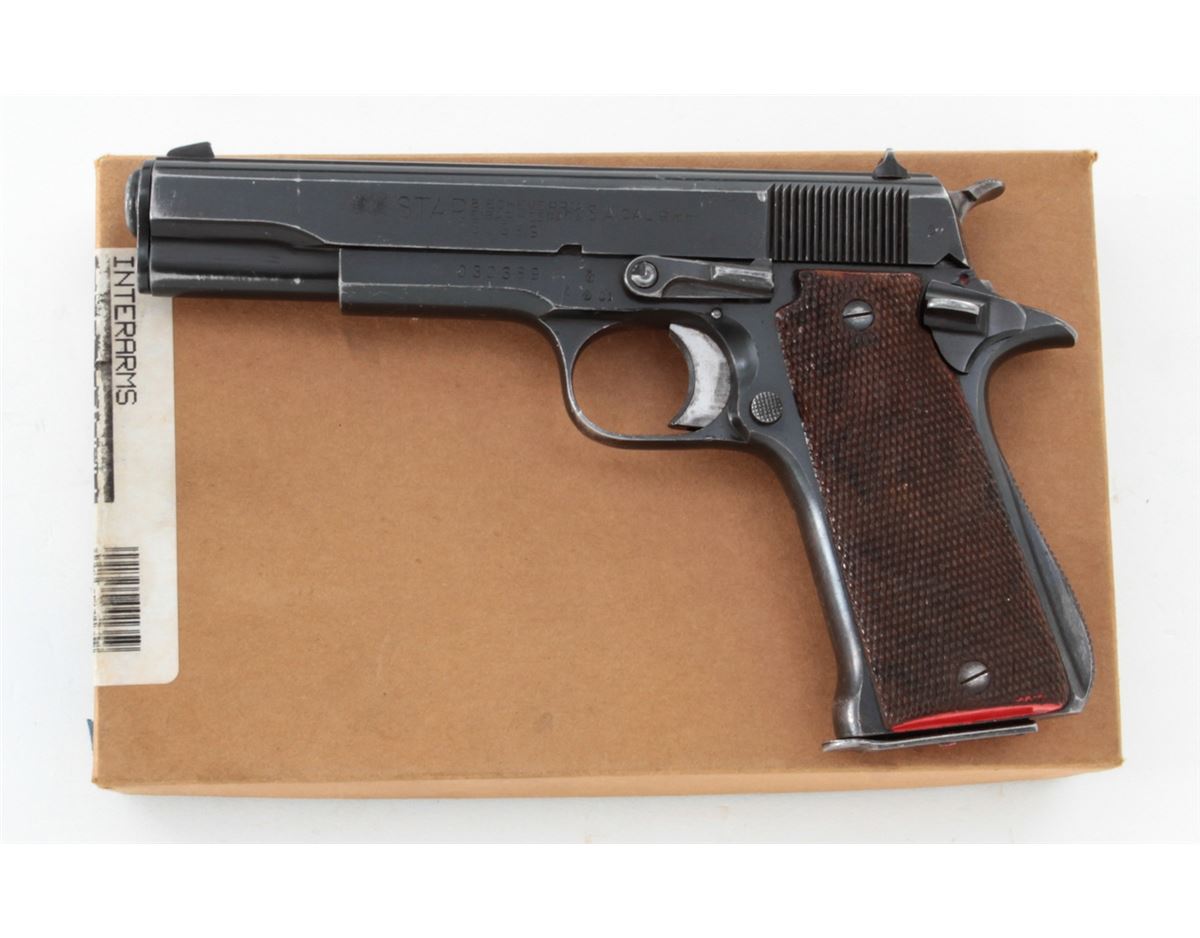 Star Modelo Super Semi-Automatic Pistol, #561085, 9mm Largo cal., 5'' barrel, blue finish, factory checkered walnut grips, with two (2) magazines. Condition is very good retaining approx. 95% blue with moderate marks from handling. Grips with mild flattening with some red paint on the butt of each grip panel. Lightly import marked. Action is crisp, bore is bright. Est.: $250-$400. (C&R/PPT)
