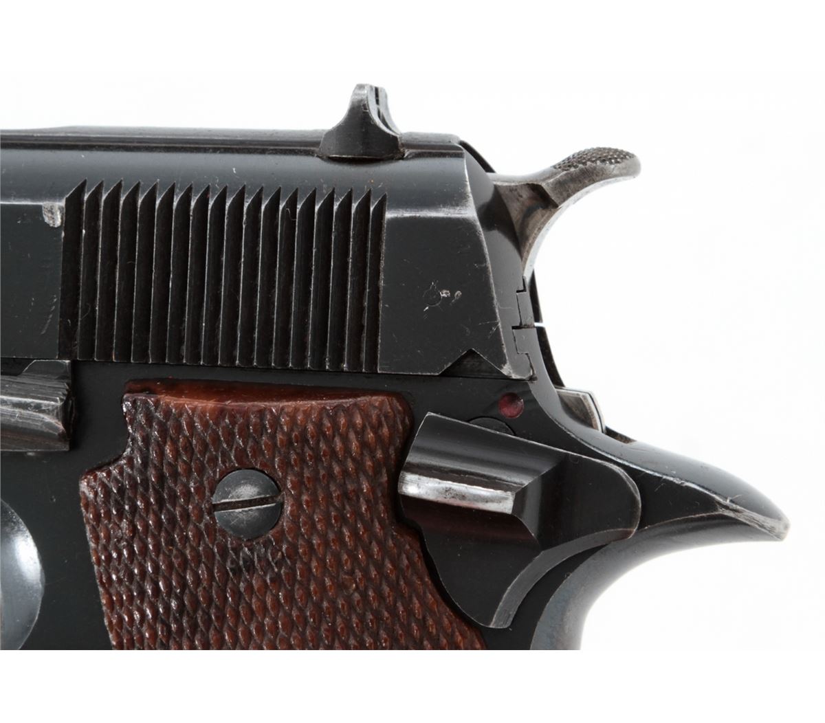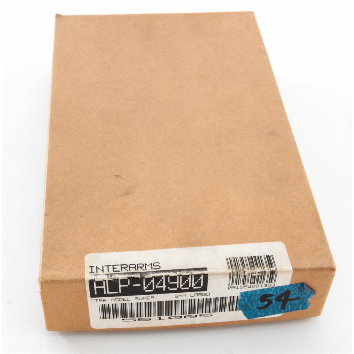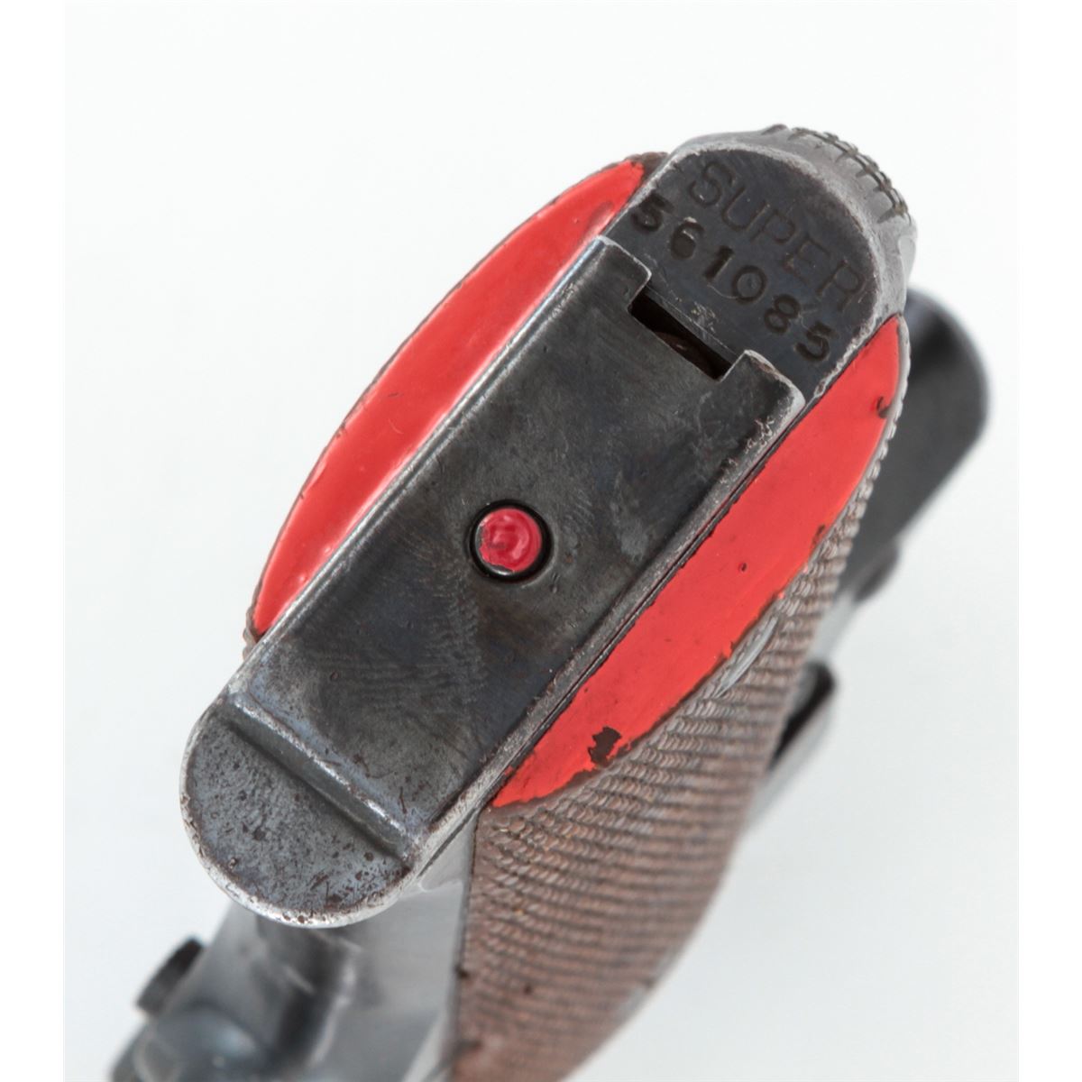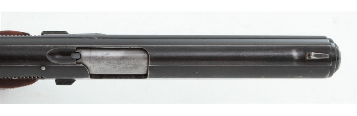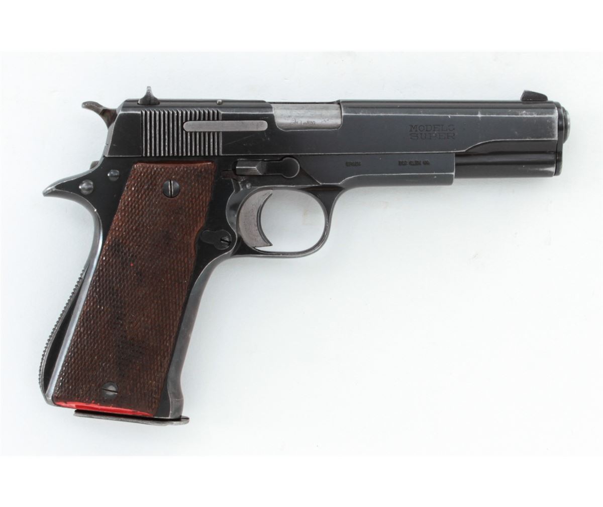 Star Modelo Super Semi-Automatic Pistol, #561085, 9mm Largo cal., 5'' barrel, blue finish, factory checkered walnut grips, with two (2) magazines. Condition is very good retaining approx. 95% blue with moderate marks from handling. Grips with mild flattening with some red paint on the butt of each grip panel. Lightly import marked. Action is crisp, bore is bright. Est.: $250-$400. (C&R/PPT)