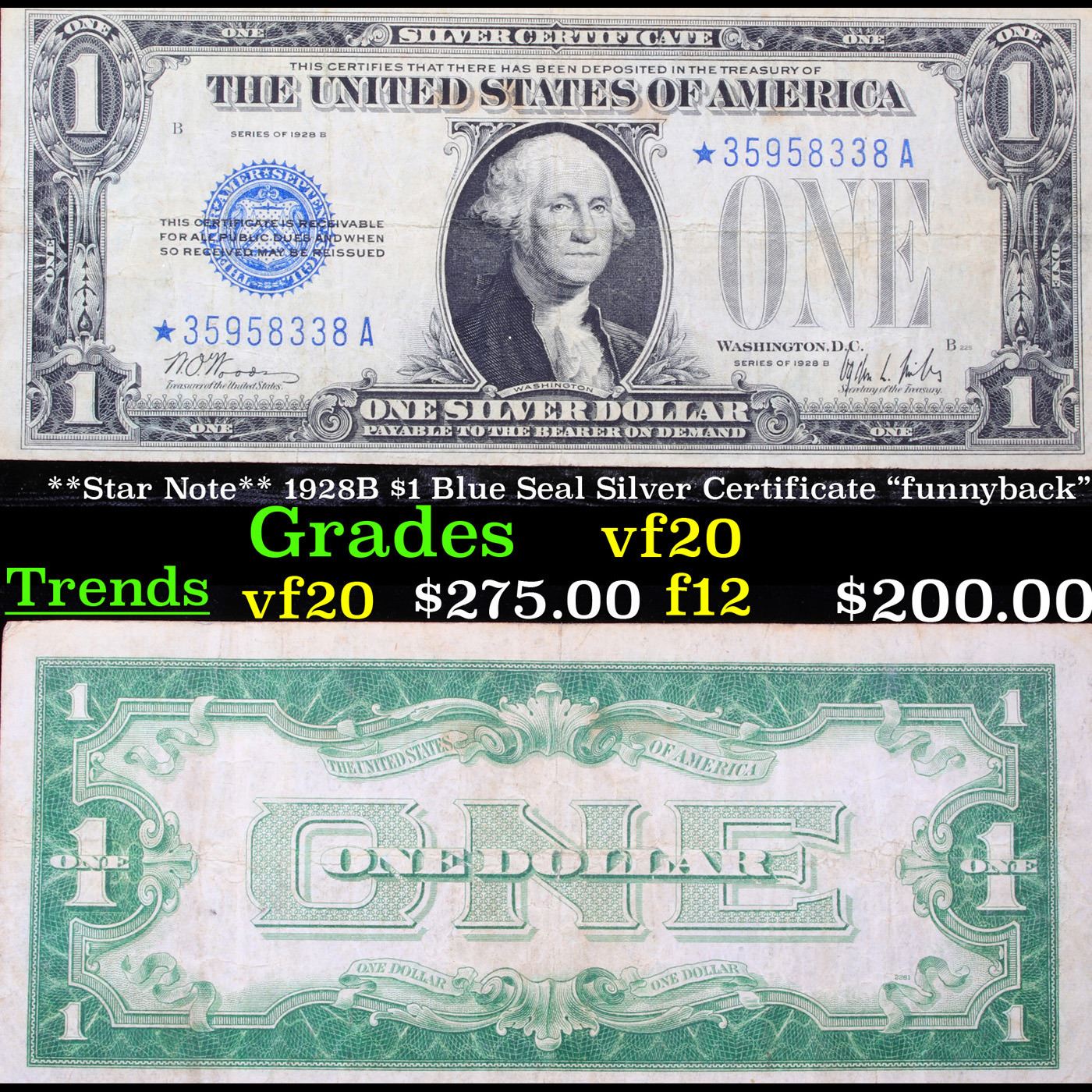 **Star Note** 1928B $1 Blue Seal Silver Certificate "funnyback" Grades vf, very fine. When notes are discovered that have been printed incorrectly (such as having the serial numbers upside down, etc.) the misprinted "error notes" are replaced with star notes because no two bills within a certain series can be produced with the same serial number. They are used to maintain a correct count of notes in a serial number run. By their nature, star notes are more scarce than notes with standard serial numbers and as such are widely collected by numismatists. Some of the highest prices paid for modern (post-1928) U.S. banknotes have been for star notes. The note itself is a Silver Certificate. Silver Certificates were redeemable in Silver. One of their most distinctive qualities is the blue Treasury seal and serial numbers. These notes include an additional legend printed on the face that is not present on any other Federal Reserve notes. The legend states that Silver had been deposited in the Treasury and was payable on demand to the note’s bearer.