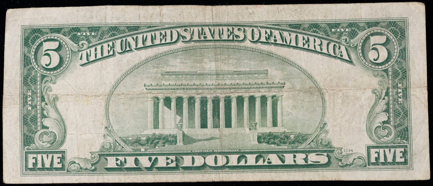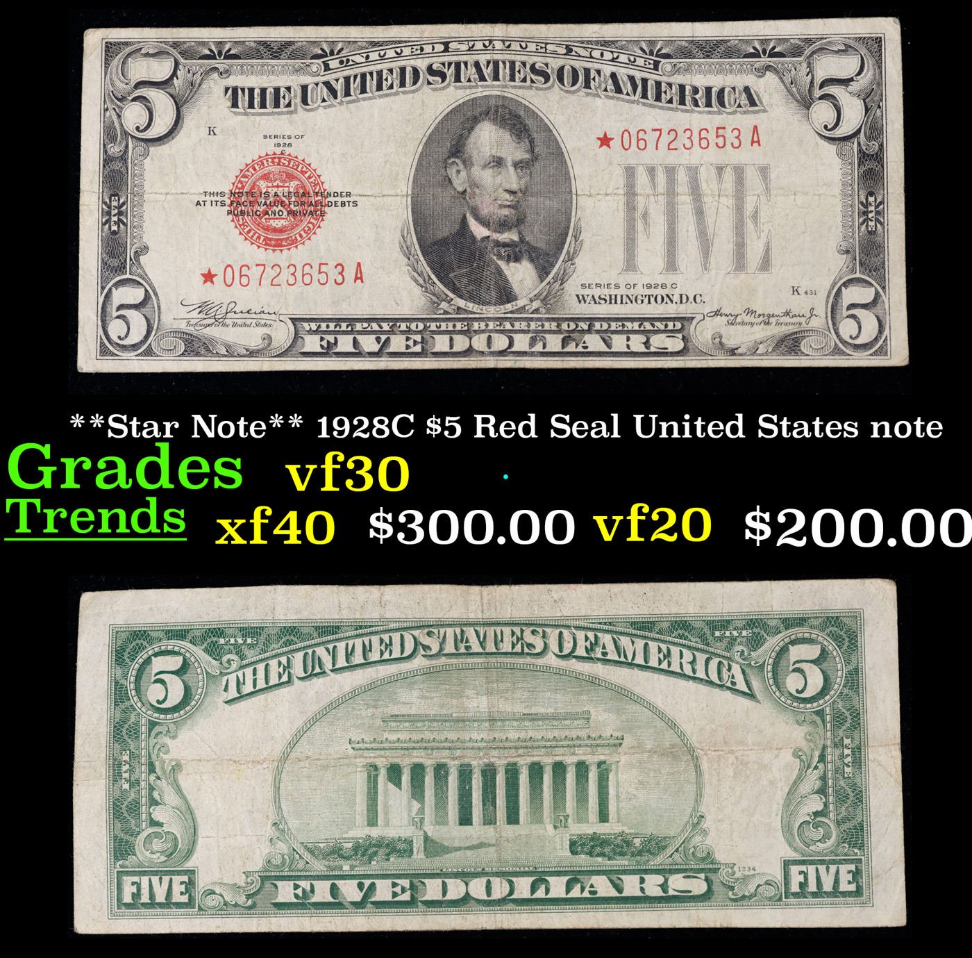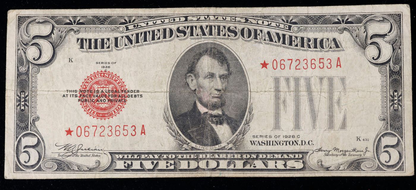 **Star Note** 1928C $5 Red Seal United States note Grades vf++.