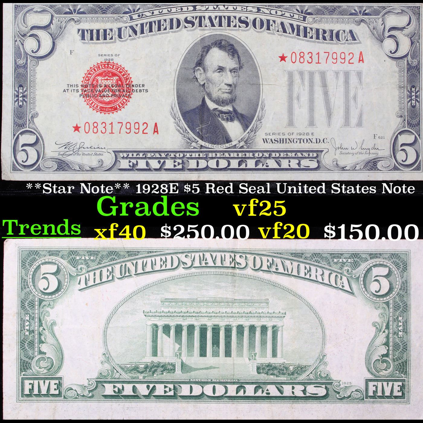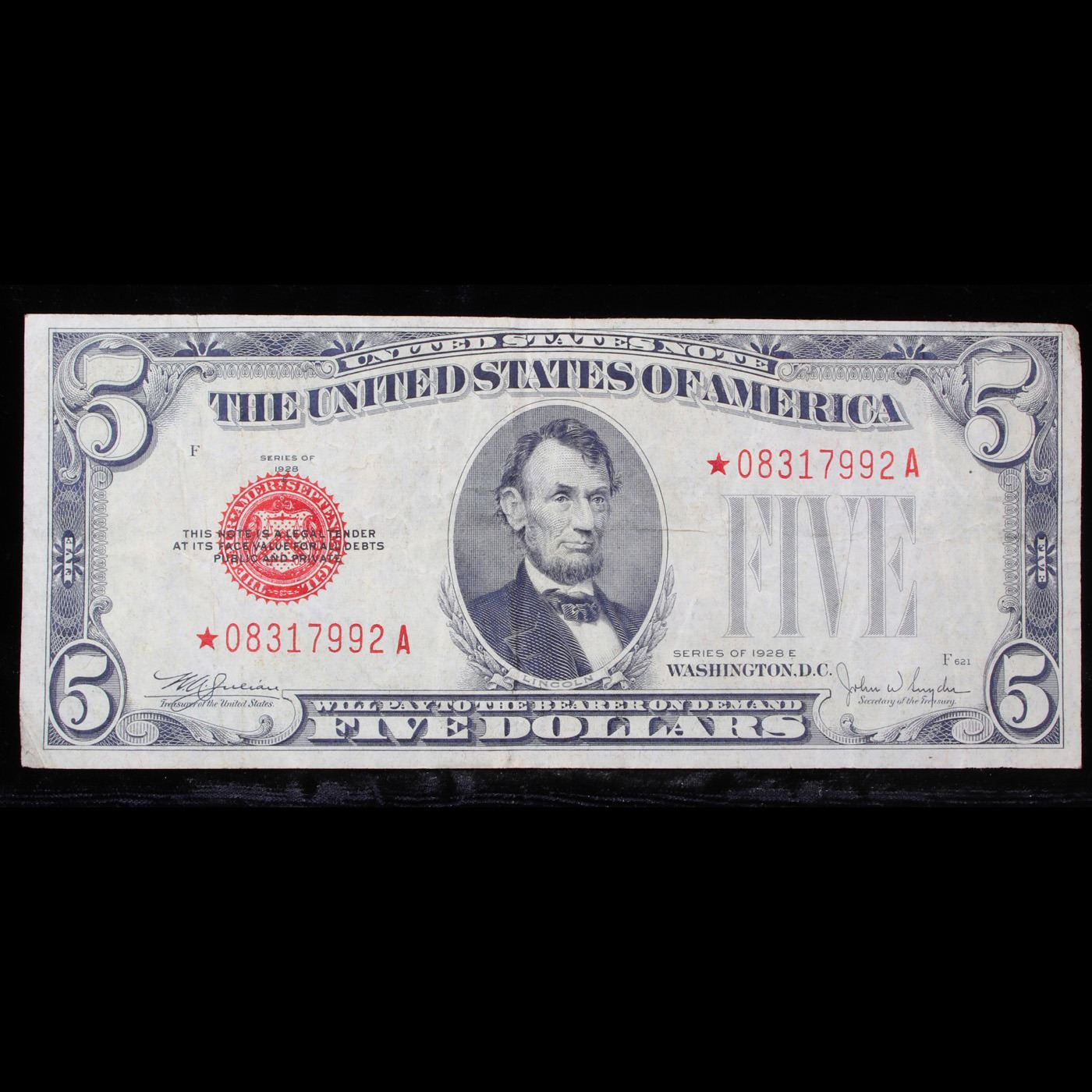 **Star Note** 1928E $5 Red Seal United States Note Grades vf+.