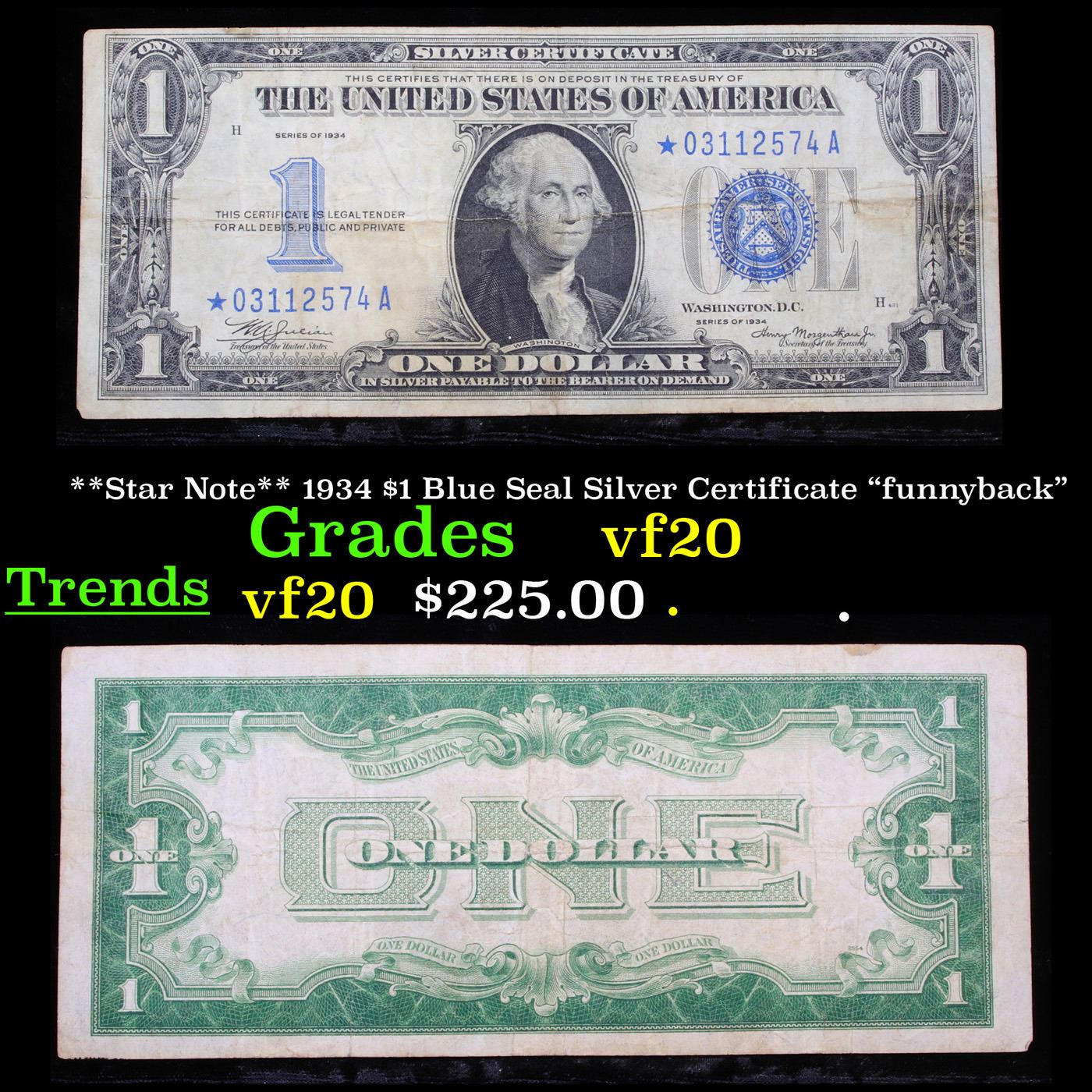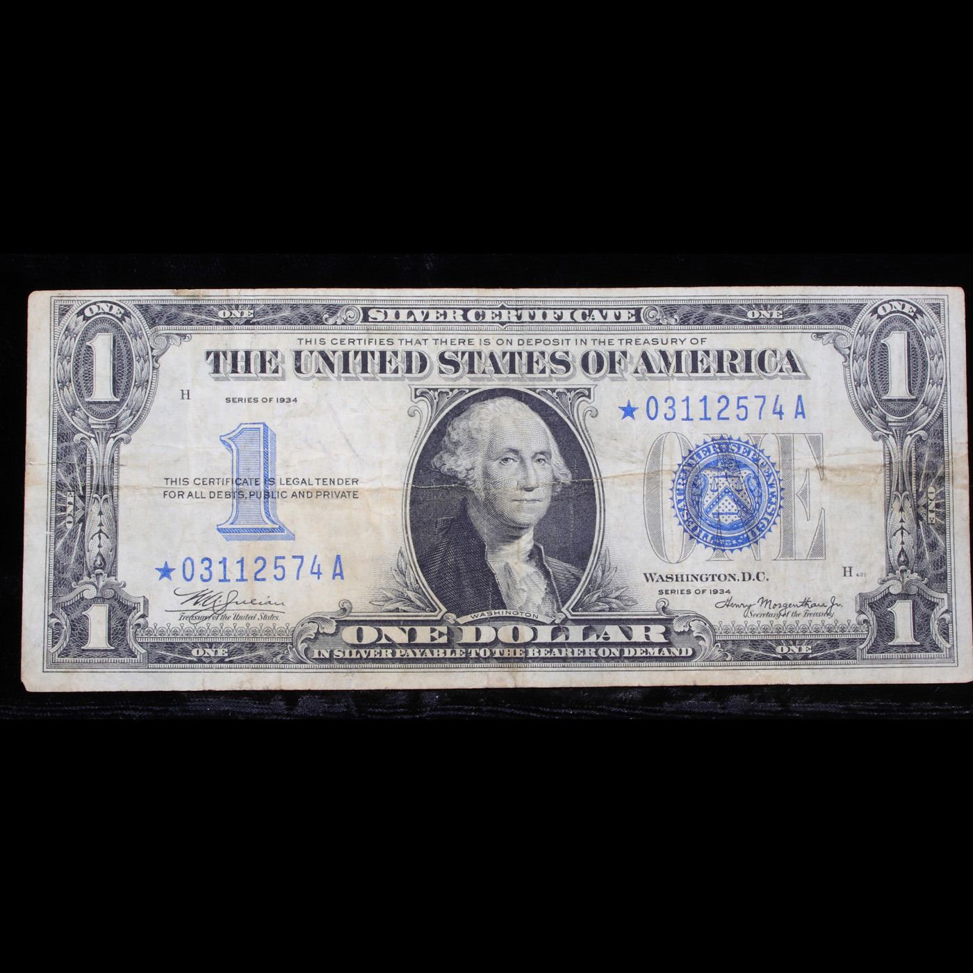 **Star Note** 1934 $1 Blue Seal Silver Certificate "funnyback" Grades vf, very fine. When notes are discovered that have been printed incorrectly (such as having the serial numbers upside down, etc.) the misprinted "error notes" are replaced with star notes because no two bills within a certain series can be produced with the same serial number. They are used to maintain a correct count of notes in a serial number run. By their nature, star notes are more scarce than notes with standard serial numbers and as such are widely collected by numismatists. Some of the highest prices paid for modern (post-1928) U.S. banknotes have been for star notes. The note itself is a Silver Certificate. Silver Certificates were redeemable in Silver. One of their most distinctive qualities is the blue Treasury seal and serial numbers. These notes include an additional legend printed on the face that is not present on any other Federal Reserve notes. The legend states that Silver had been deposited in the Treasury and was payable on demand to the note’s bearer.