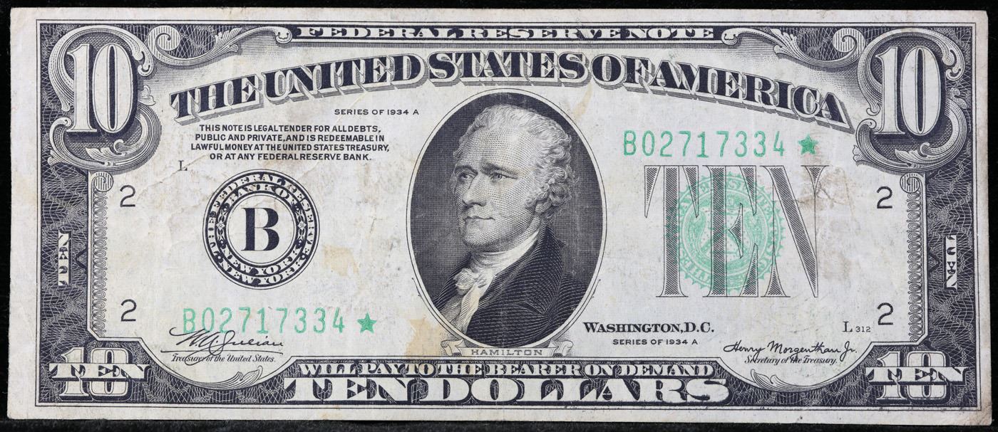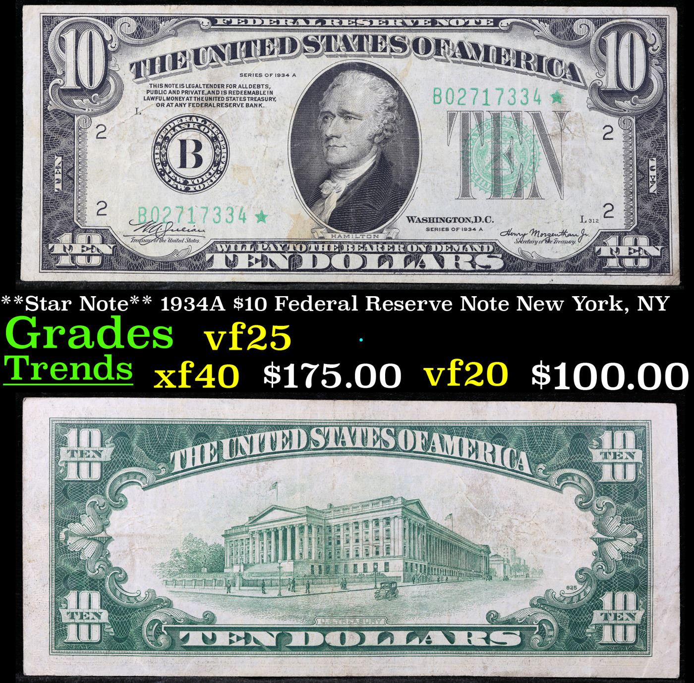**Star Note** 1934A $10 Federal Reserve Note New York, NY Grades vf+.