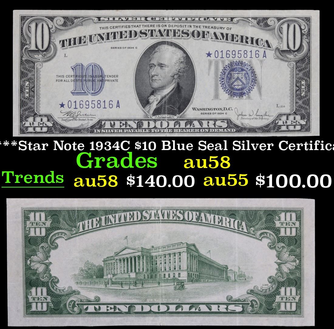 ***Star Note 1934C $10 Blue Seal Silver Certificate Grades Choice AU/BU Slider. This lot is for a great example of the $10 Blue Seal Silver Certificate. Series 1934C, signatures Julian-Snyder. This note features the familiar portrait of Alexander Hamilton that was used on all of our $10 bills through 1999, and the back shows the US Treasury. This note does not have the familiar "In God We Trust" motto above the US Treasury, though, as that motto was not added until 1957. The Blue Seal is large and at right; a large blue "10" dominates the left side of the note. When notes are discovered that have been printed incorrectly (such as having the serial numbers upside down, etc.) the misprinted "error notes" are replaced with star notes because no two bills within a certain series can be produced with the same serial number. They are used to maintain a correct count of notes in a serial number run. By their nature, star notes are more scarce than notes with standard serial numbers and as such are widely collected by numismatists. Some of the highest prices paid for modern (post-1928) U.S. banknotes have been for star notes.