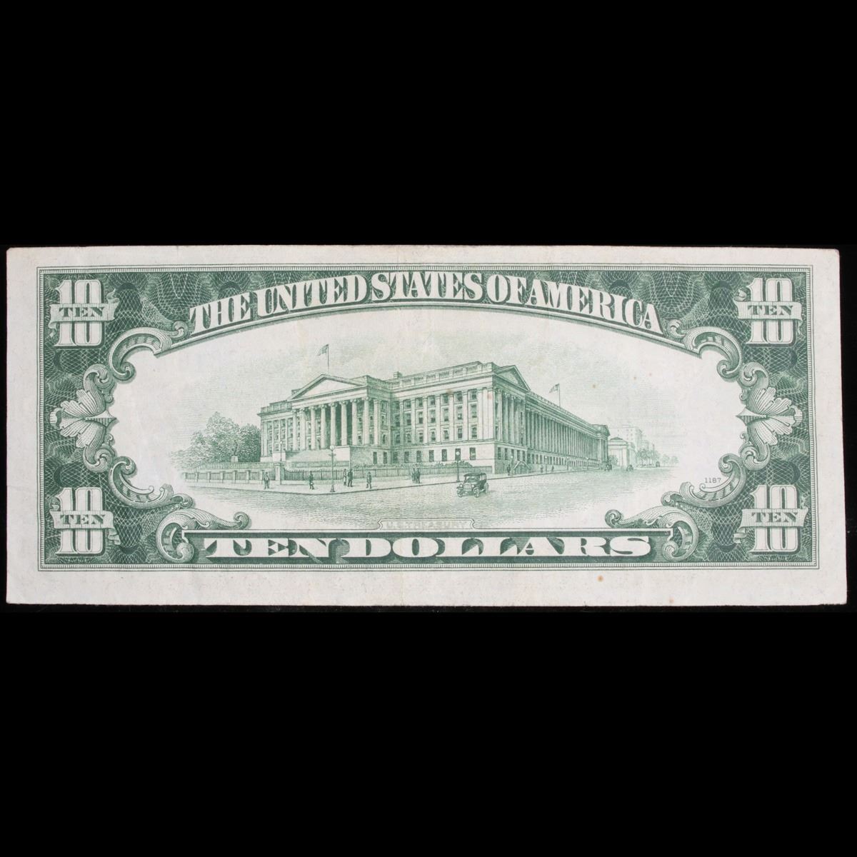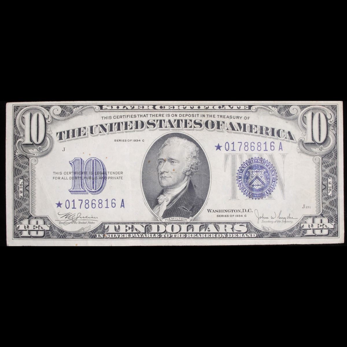*Star Note 1934C $10 Blue Seal Silver Certificate Signatures Julian/Snyder Grades. This lot is for a $10 Blue Seal Silver Certificate. Series 1934C, signatures Julian-Snyder, FR2008. This note features the familiar portrait of Alexander Hamilton that was used on all of our $10 bills through 1999, and the back shows the US Treasury. This note does not have the familiar "In God We Trust" motto above the US Treasury, though, as that motto was not added until 1957. The Blue Seal is large and at right; a large blue "10" dominates the left side of the note. When notes are discovered that have been printed incorrectly (such as having the serial numbers upside down, etc.) the misprinted "error notes" are replaced with star notes because no two bills within a certain series can be produced with the same serial number. They are used to maintain a correct count of notes in a serial number run. By their nature, star notes are more scarce than notes with standard serial numbers and as such are widely collected by numismatists. Some of the highest prices paid for modern (post-1928) U.S. banknotes have been for star notes.
