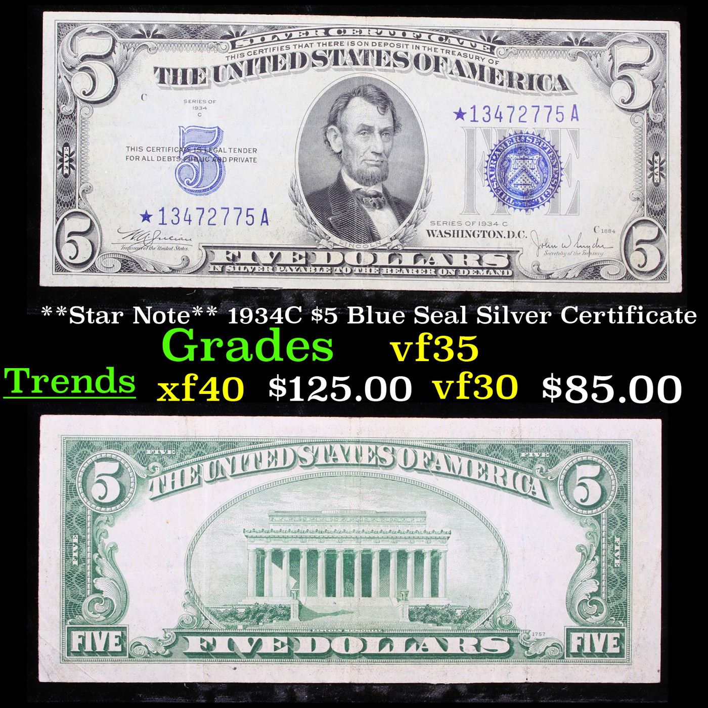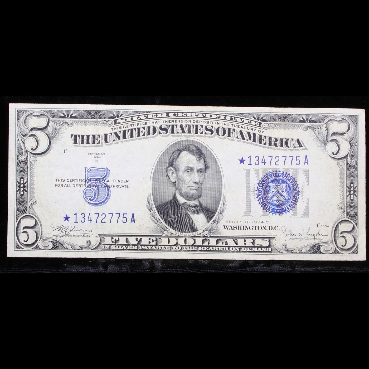 **Star Note** 1934C $5 Blue Seal Silver Certificate Grades vf++.