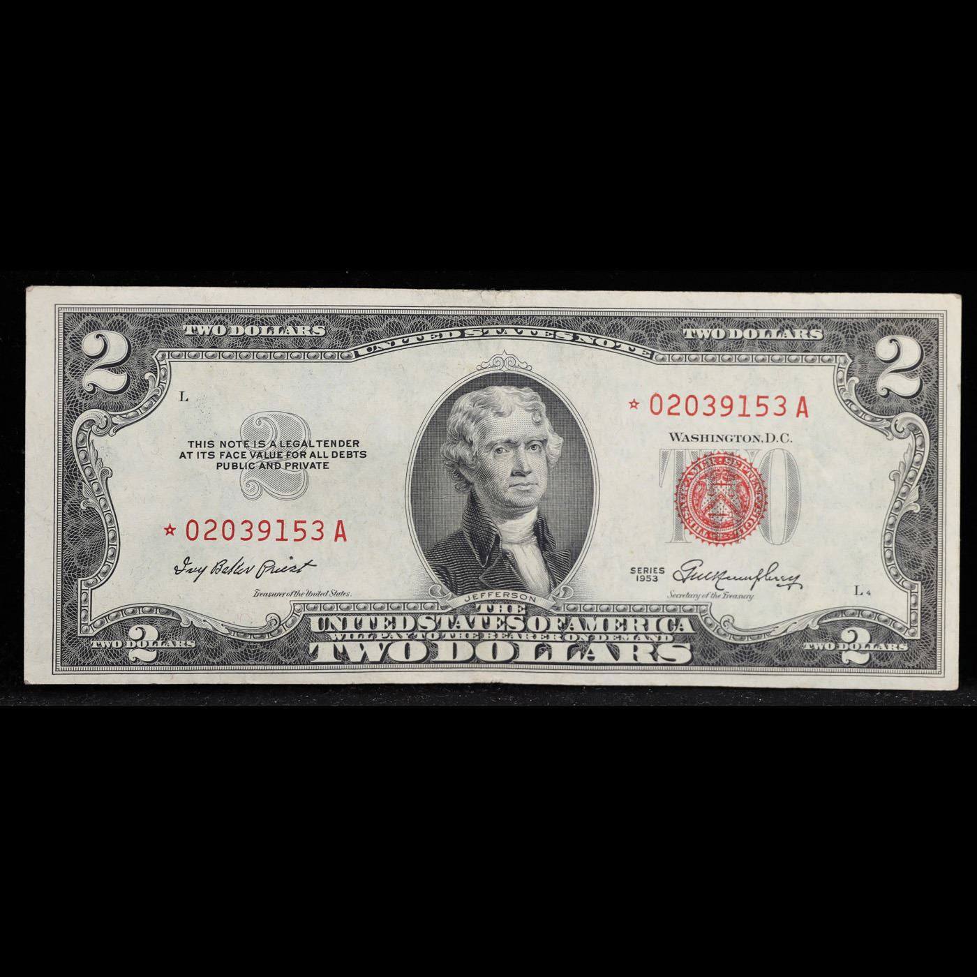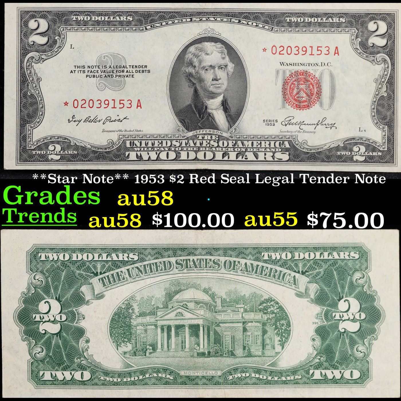 **Star Note** 1953 $2 Red Seal Legal Tender Note Grades Choice AU/BU Slider.