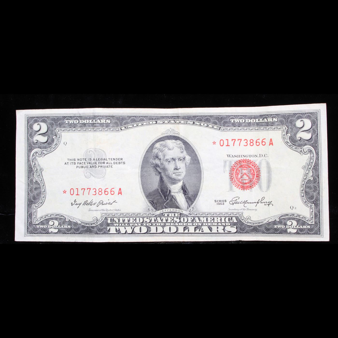 *Star Note* 1953 $2 Red Seal United States Note Grades AU, Almost Unc.