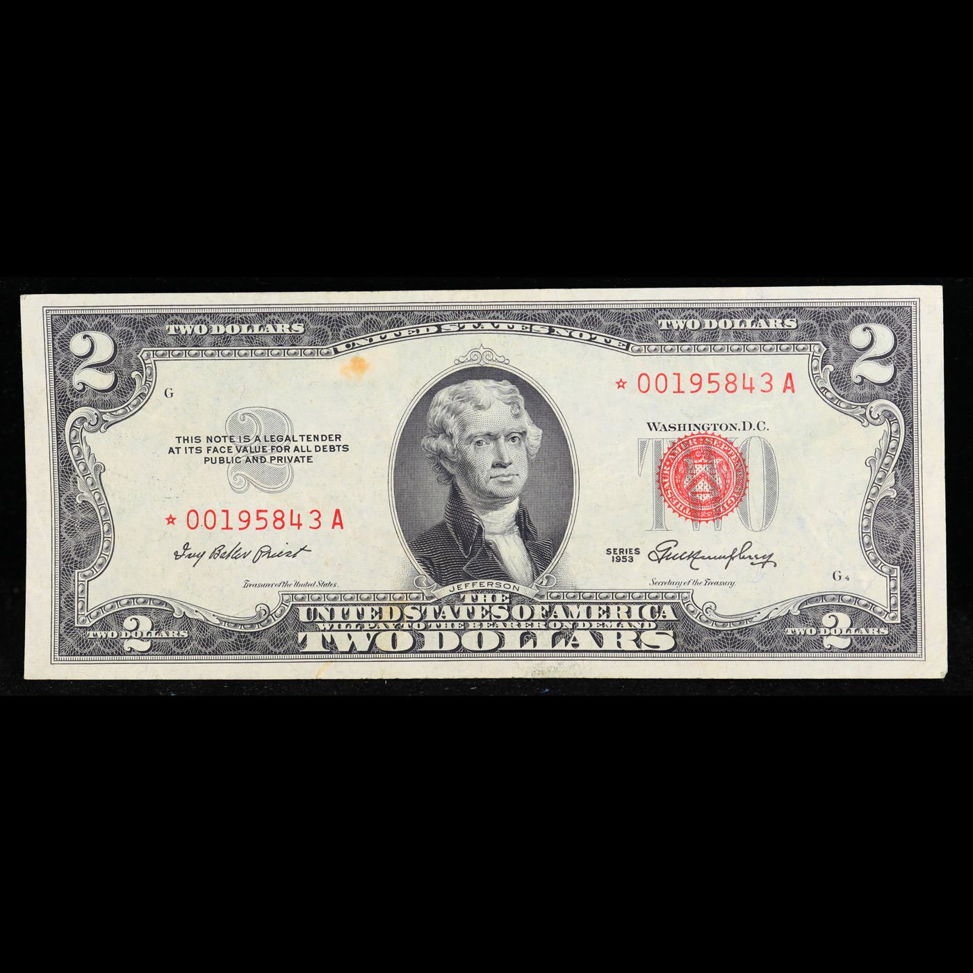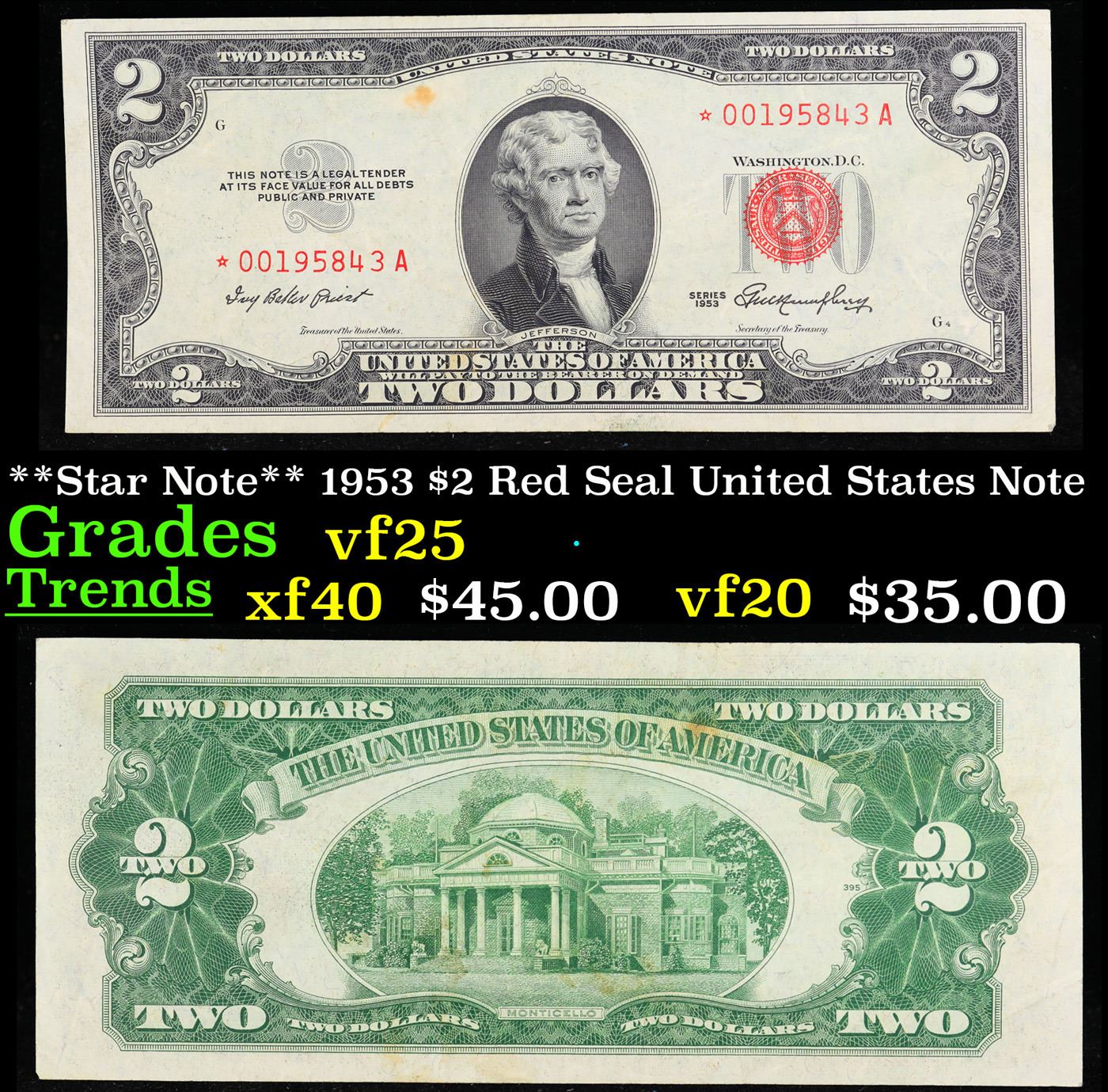 **Star Note** 1953 $2 Red Seal United States Note Grades vf+.