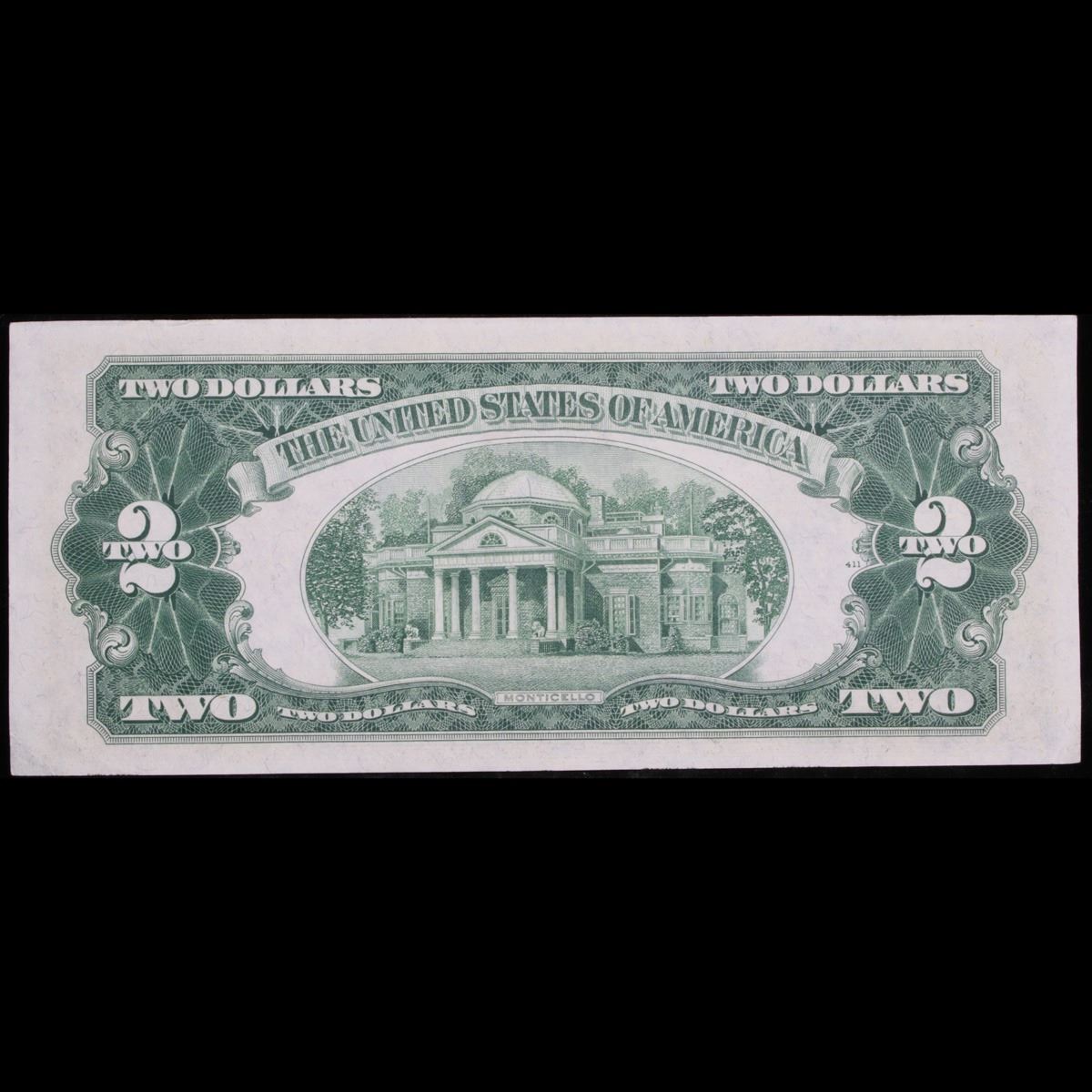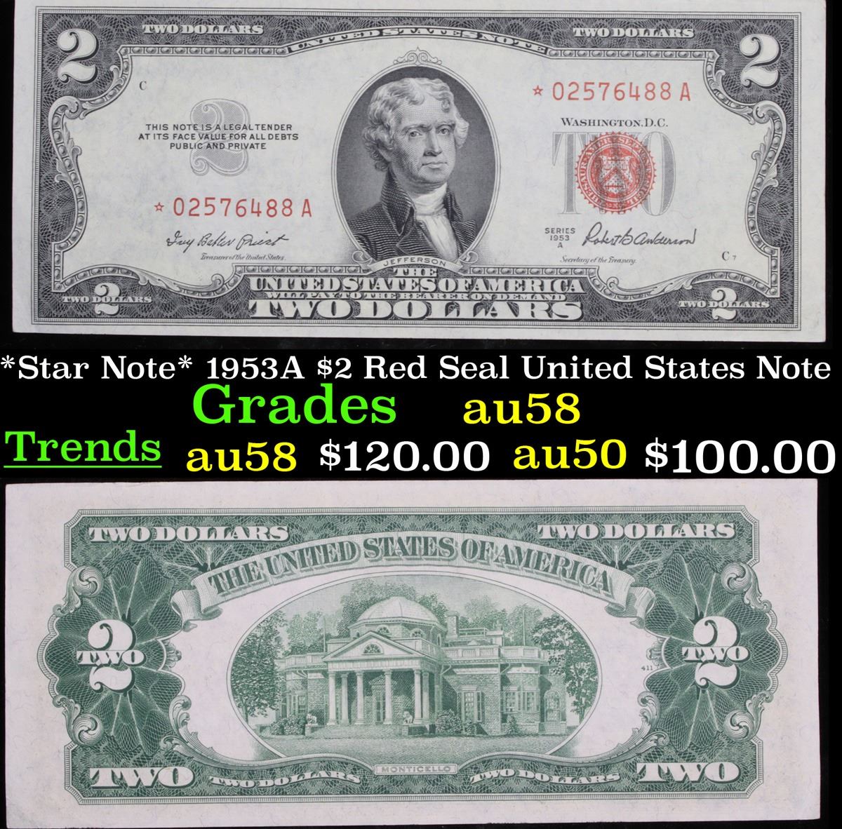 *Star Note* 1953A $2 Red Seal United States Note Grades Choice AU/BU Slider. 1953 red print two dollar bills can be broken up into four different types by signature combination. 1953 two dollar bills feature Thomas Jefferson as the central figure. The back of the bill shows Monticello. These were printed in Washington DC and circulated across the country. They have red overprints and a red seal on the right hand side of the bill. You can find the following phrases on the bill, “Two Dollars, United States Note, The United States of America will pay to the bearer on demand Two Dollars” “This note is a legal tender at its face value for all debts public and private”. When notes are discovered that have been printed incorrectly (such as having the serial numbers upside down, etc.) the misprinted "error notes" are replaced with star notes because no two bills within a certain series can be produced with the same serial number. They are used to maintain a correct count of notes in a serial number run. By their nature, star notes are more scarce than notes with standard serial numbers and as such are widely collected by numismatists. Some of the highest prices paid for modern (post-1928) U.S. banknotes have been for star notes.