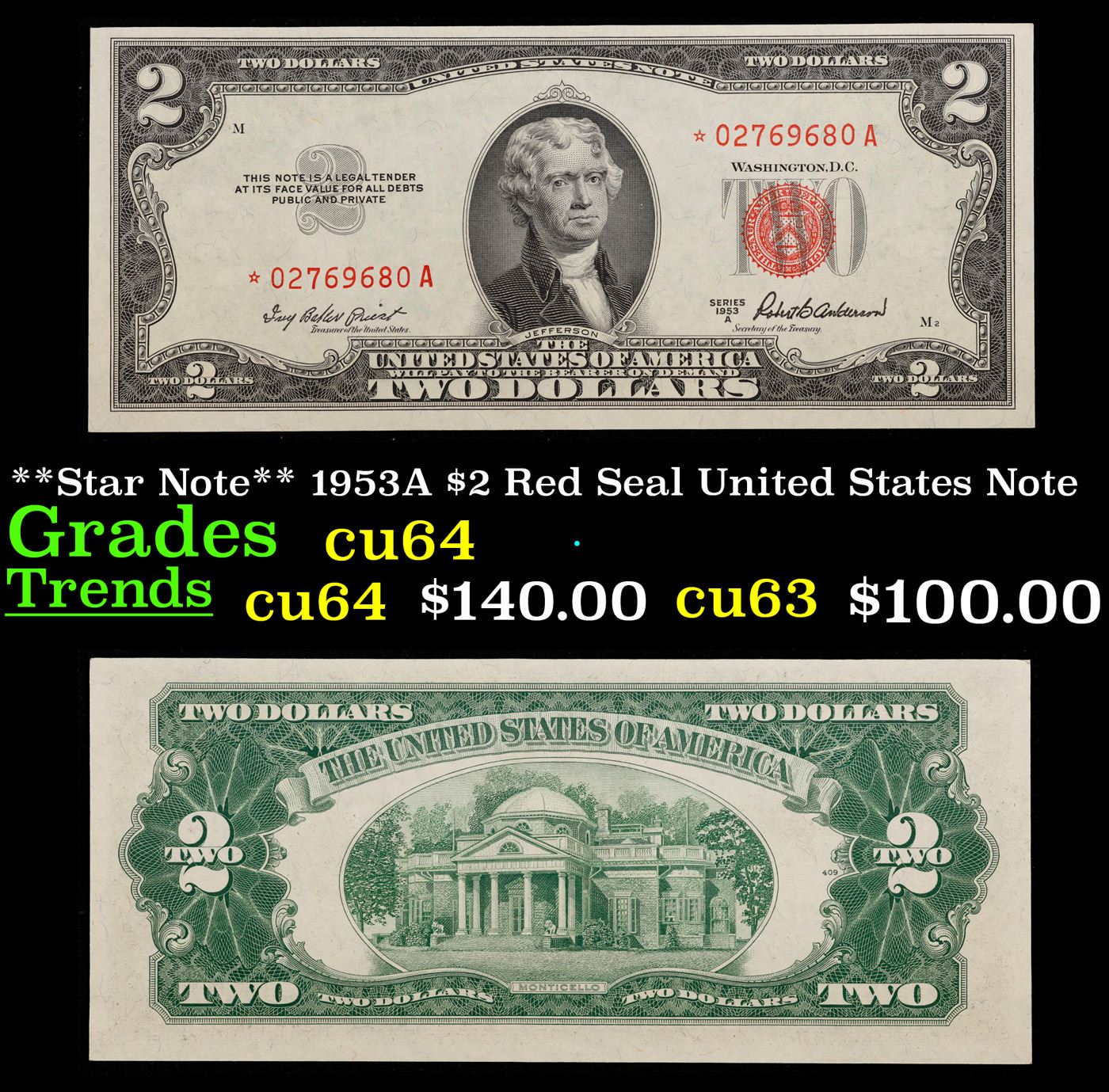 **Star Note** 1953A $2 Red Seal United States Note Grades Choice CU. 1953 red print two dollar bills can be broke up into four different types by signature combination; 1953 – Ivy Baker Priest (Treasurer of The United States) and G.M. Humphrey (Secretary of the Treasury), 1953A – Ivy Baker Priest and Robert B Anderson, 1953B – Elizabeth Rudel Smith and C. Douglas Dillon, 1953C – Kathryn O’Hay Granahan and C. Douglas Dillon. 1953 two dollar bills feature Thomas Jefferson as the central figure. The back of the bill shows Monticello. These were printed in Washington DC and circulated across the country. They have red overprints and a red seal on the right hand side of the bill. You can find the following phrases on the bill: “Two Dollars, United States Note, The United States of America will pay to the bearer on demand Two Dollars” “This note is a legal tender at its face value for all debts public and private”