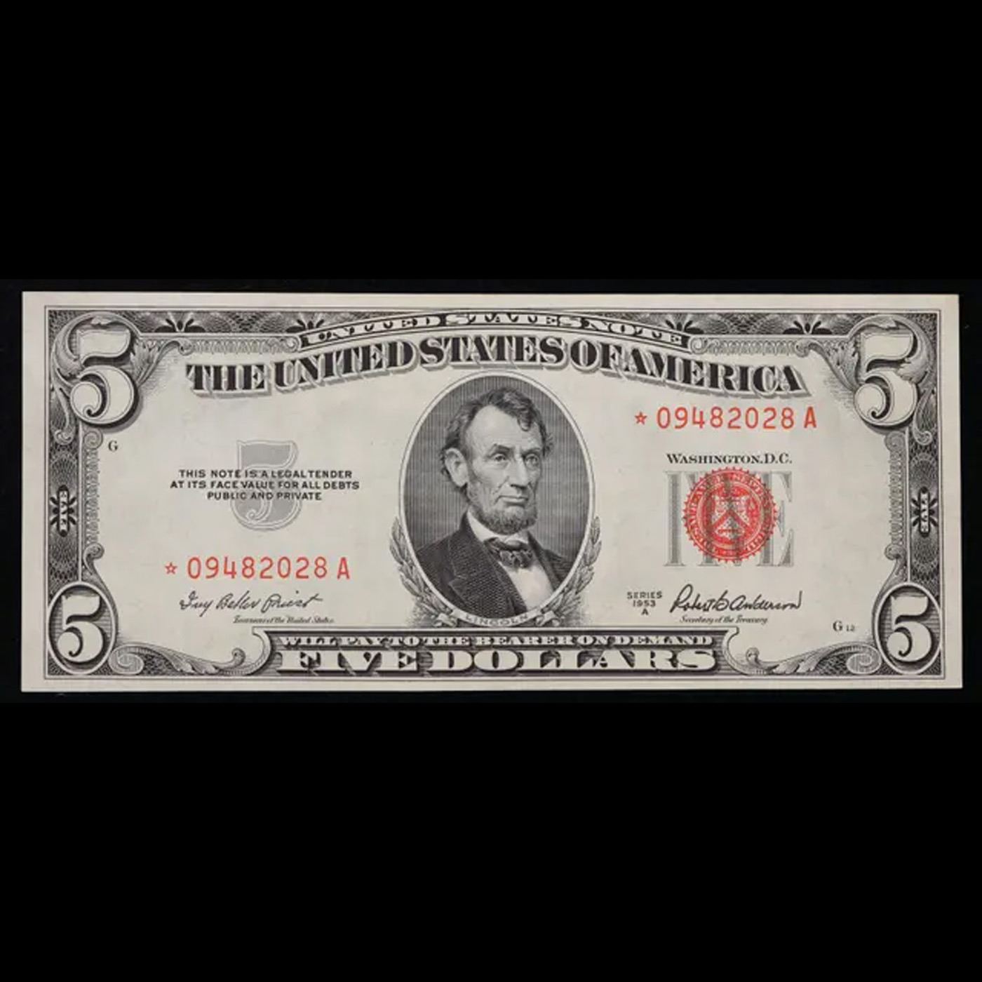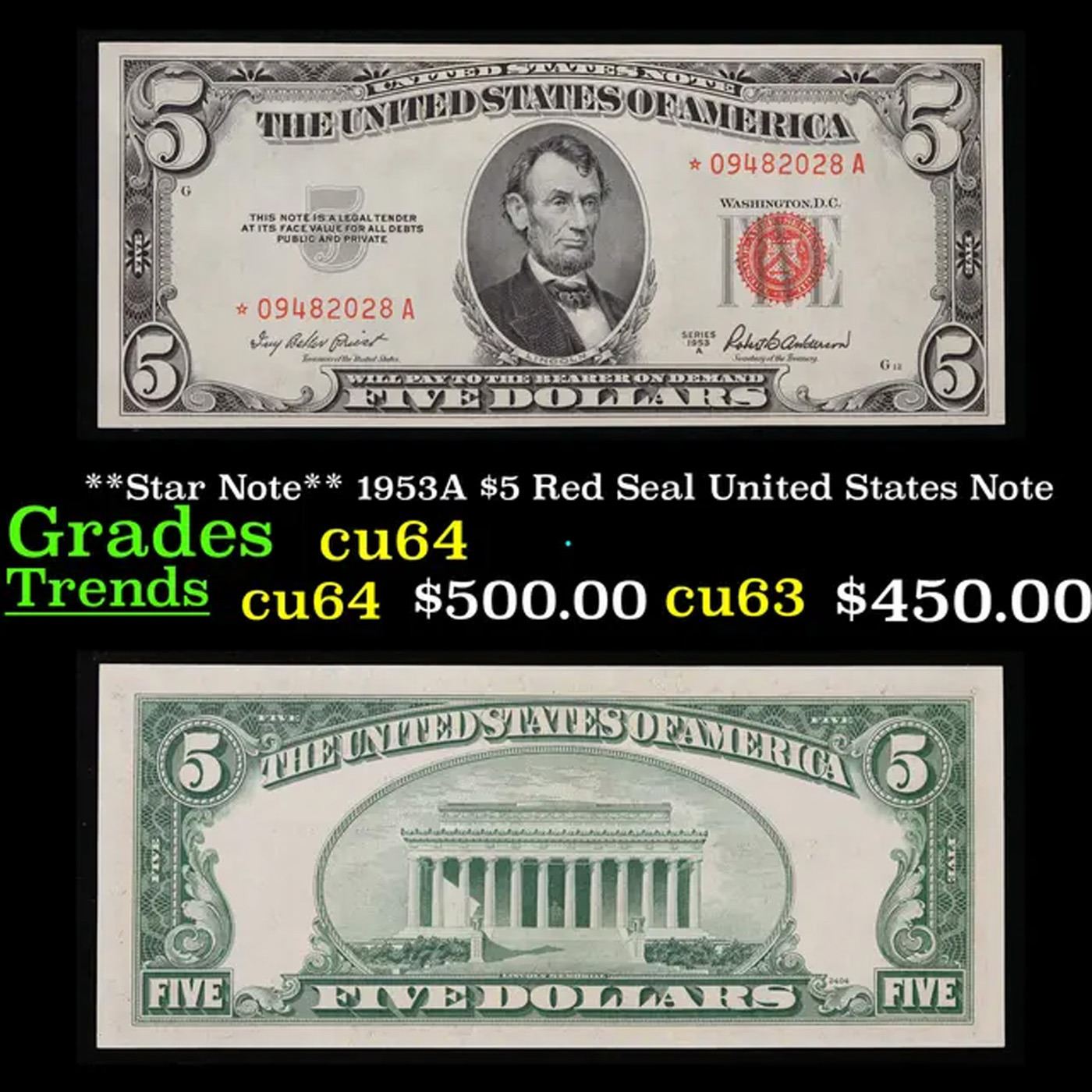 **Star Note** 1953A $5 Red Seal United States Note Grades Choice CU.