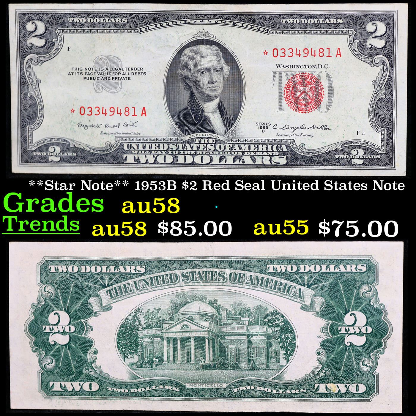 **Star Note** 1953B $2 Red Seal United States Note Grades Choice AU/BU Slider. When notes are discovered that have been printed incorrectly (such as having the serial numbers upside down, etc.) the misprinted "error notes" are replaced with star notes because no two bills within a certain series can be produced with the same serial number. They are used to maintain a correct count of notes in a serial number run. By their nature, star notes are more scarce than notes with standard serial numbers and as such are widely collected by numismatists. Some of the highest prices paid for modern (post-1928) U.S. banknotes have been for star notes.