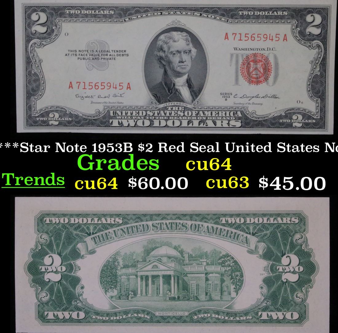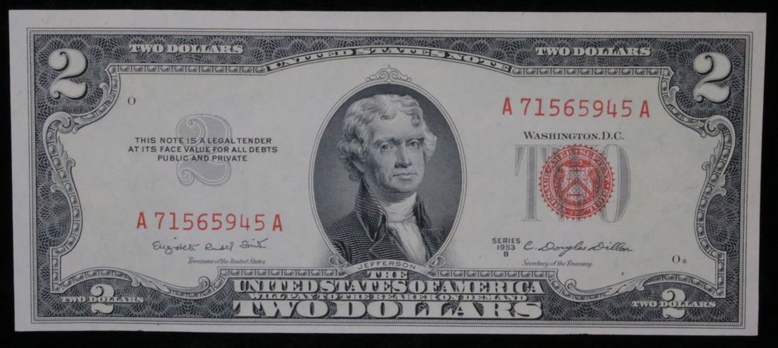***Star Note 1953B $2 Red Seal United States Note Grades Choice CU. 1953 red print two dollar bills can be broken up into four different types by signature combination: 1953 Priest/Humphrey, 1953A Priest/Anderson, 1953B Smith/Dillon, and 1953C Granahan/Dillon. 1953 two dollar bills feature Thomas Jefferson as the central figure. The back of the bill shows Monticello. These were printed in Washington DC and circulated across the country. They have red overprints and a red seal on the right hand side of the bill.