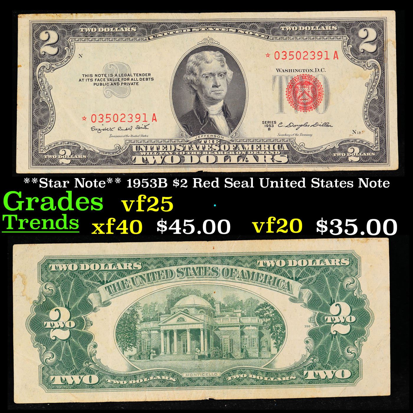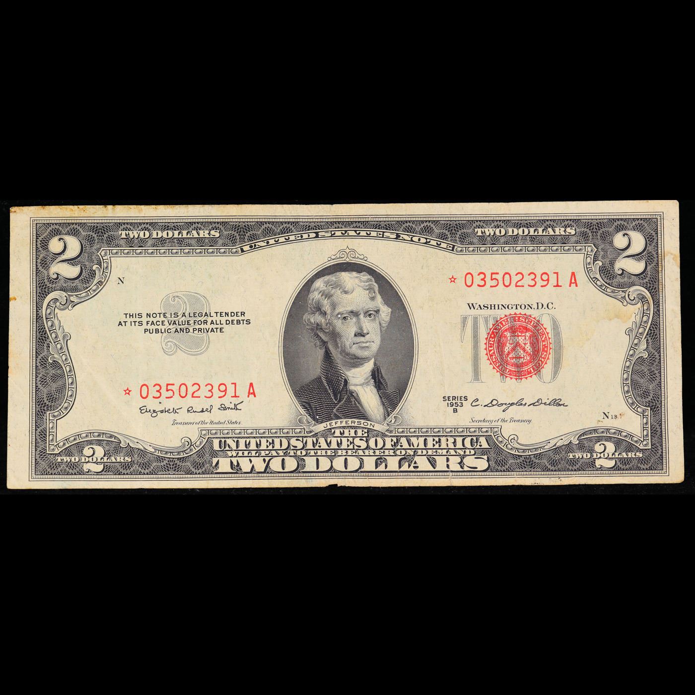 **Star Note** 1953B $2 Red Seal United States Note Grades vf+.