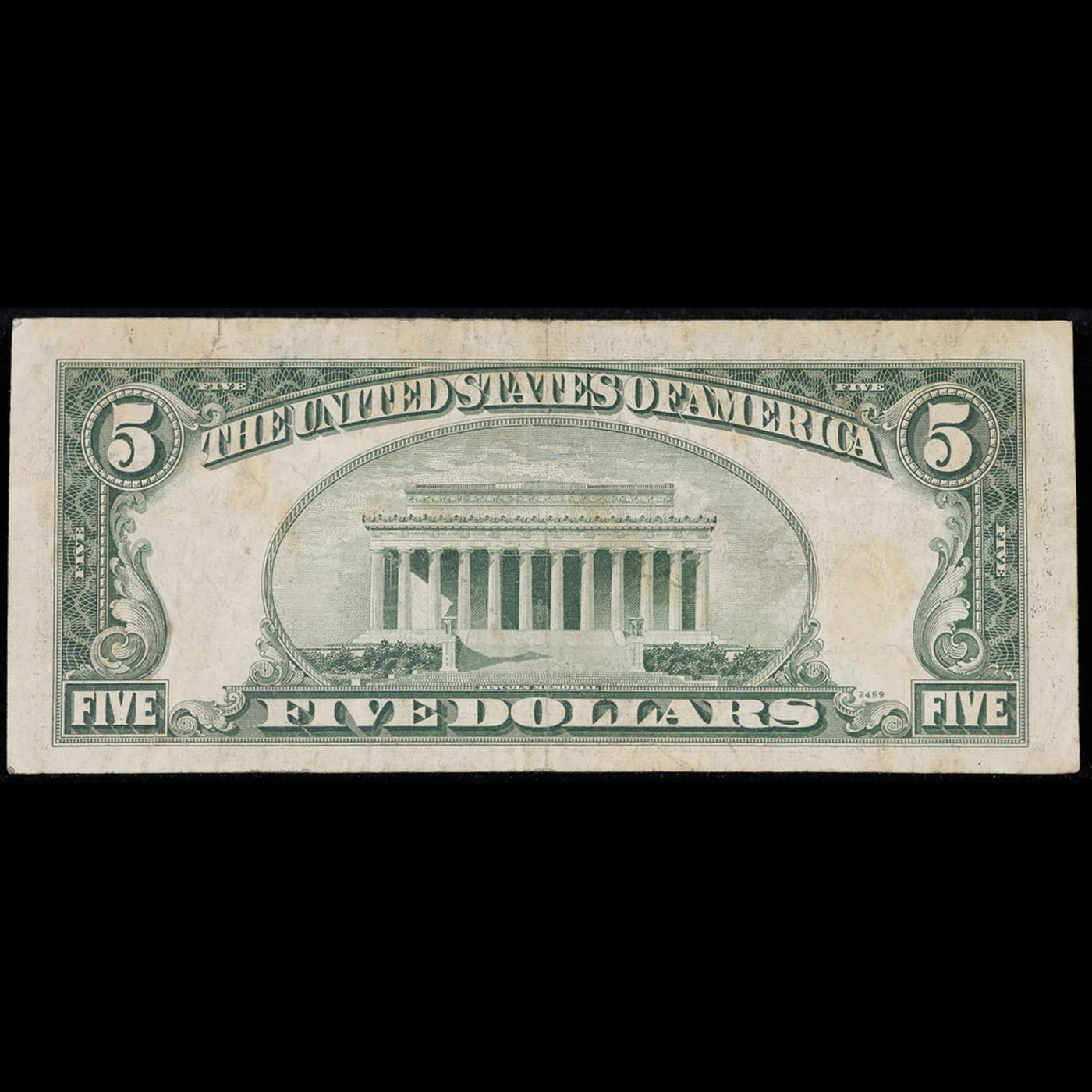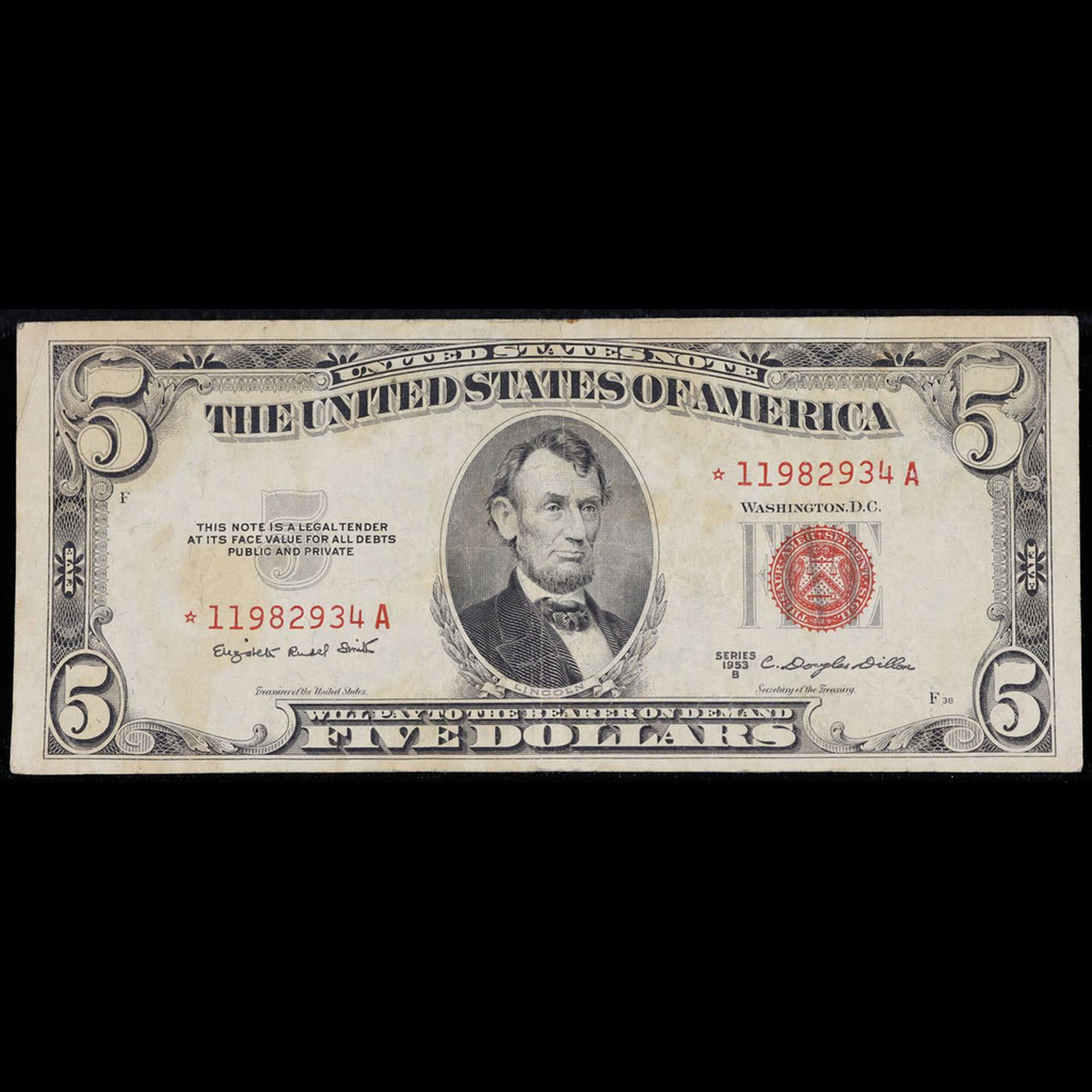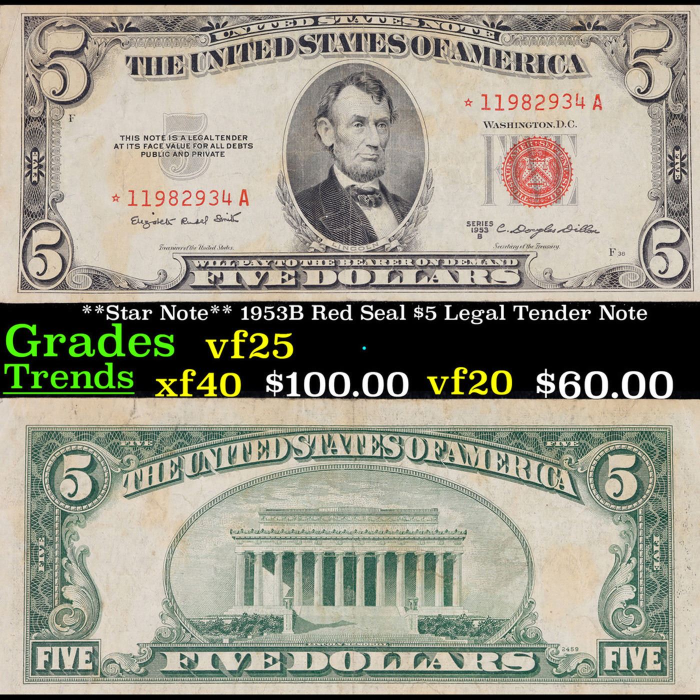 **Star Note** 1953B Red Seal $5 Legal Tender Note Grades vf+.