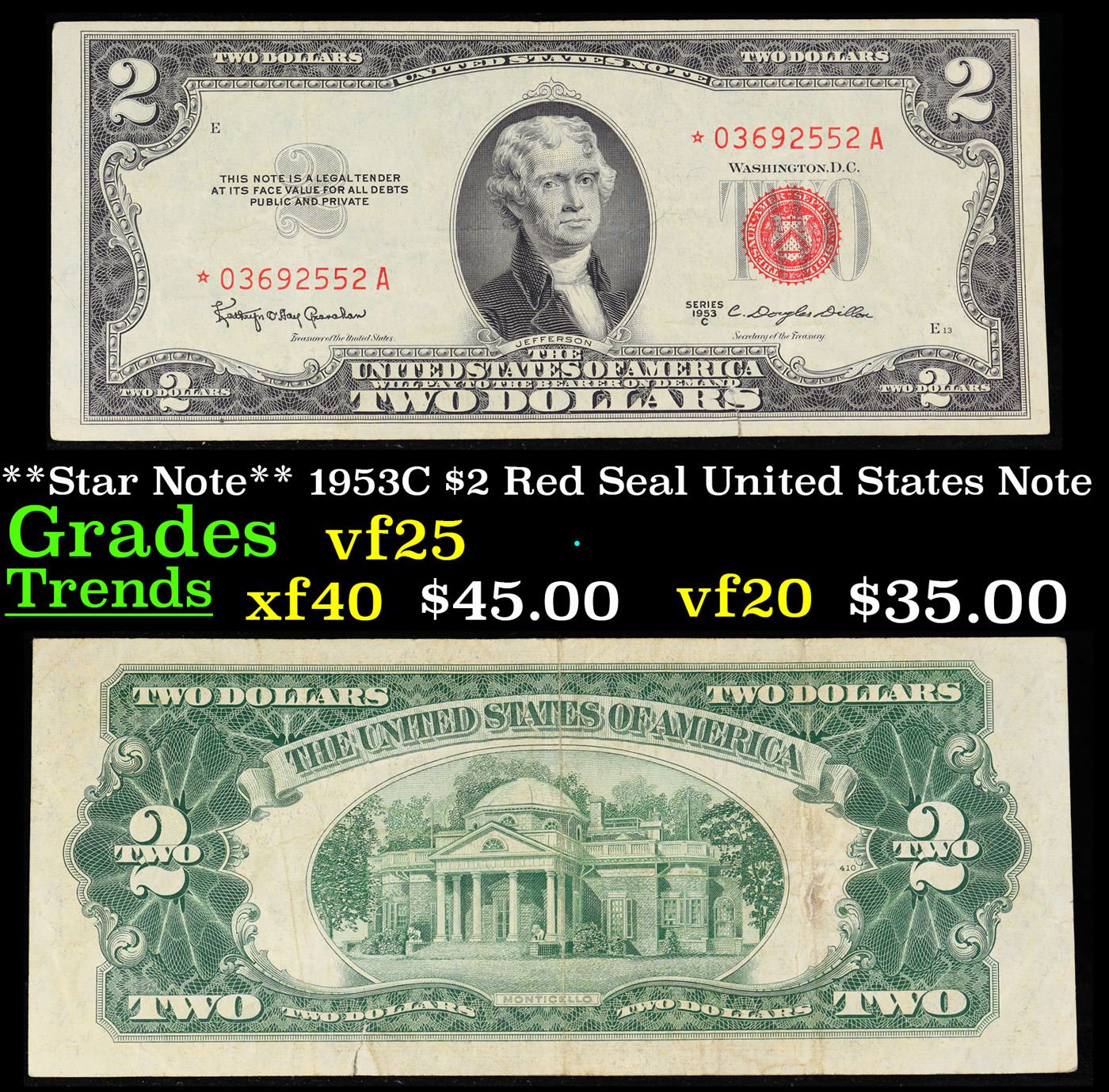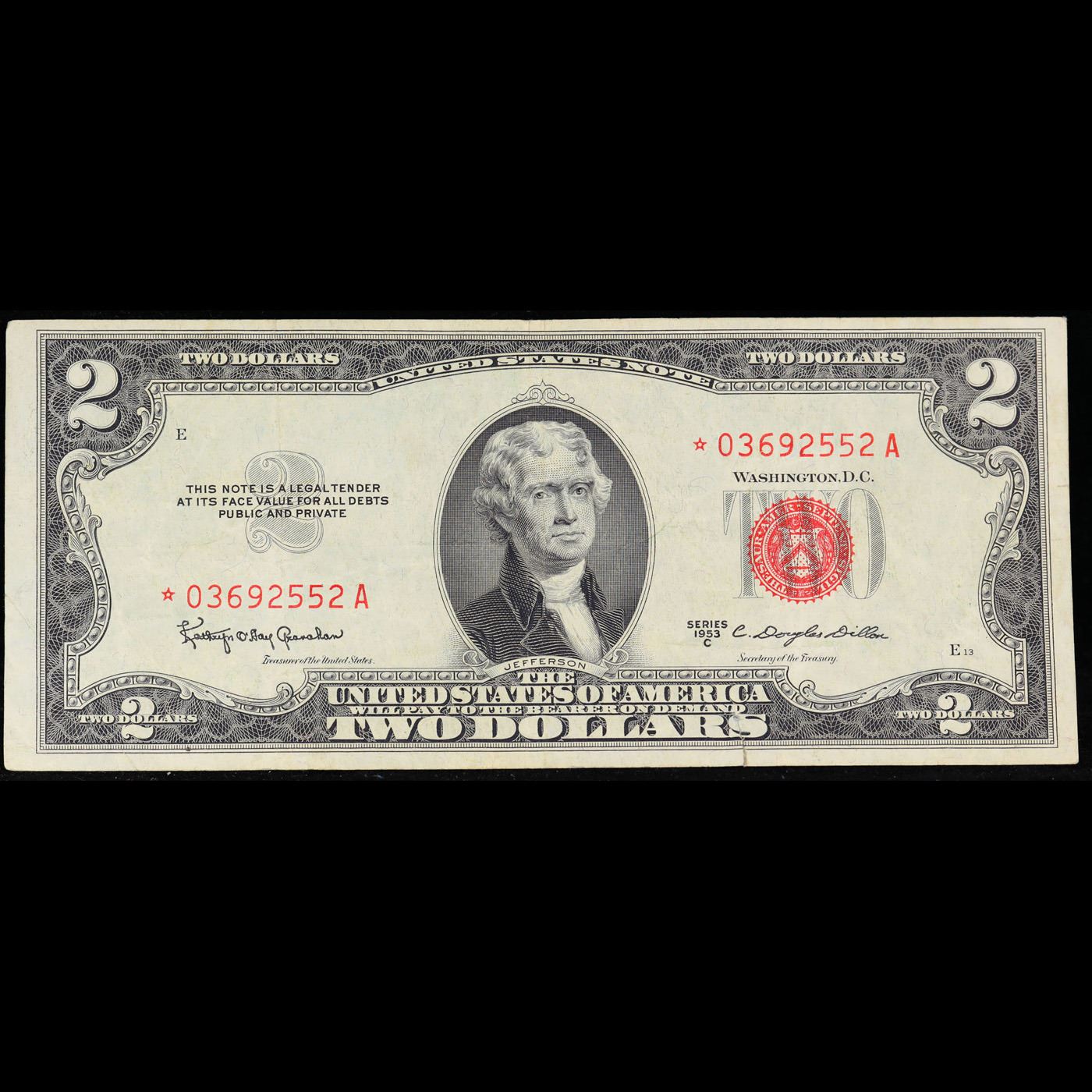 **Star Note** 1953C $2 Red Seal United States Note Grades vf+.