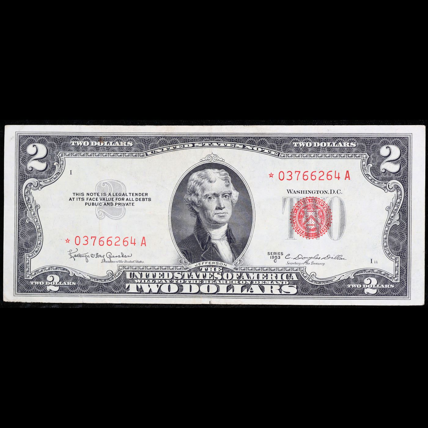 **Star Note** 1953C $2 Red Seal United States Note Grades vf++. When notes are discovered that have been printed incorrectly (such as having the serial numbers upside down, etc.) the misprinted "error notes" are replaced with star notes because no two bills within a certain series can be produced with the same serial number. They are used to maintain a correct count of notes in a serial number run. By their nature, star notes are more scarce than notes with standard serial numbers and as such are widely collected by numismatists. Some of the highest prices paid for modern (post-1928) U.S. banknotes have been for star notes.