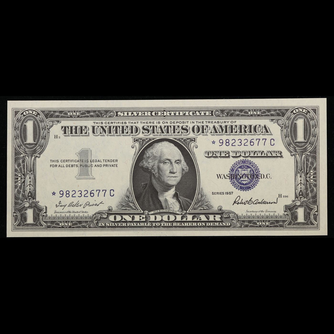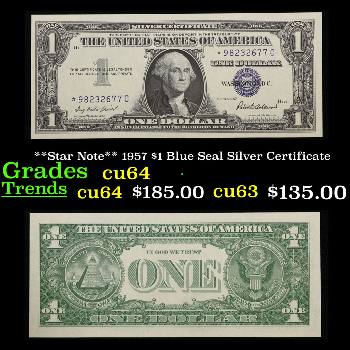 **Star Note** 1957 $1 Blue Seal Silver Certificate Grades Choice CU. When a currency note is deemed imperfect in its manufacture, it is replaced with a Star Note which bears a star before or after the serial number. Star Notes are scarcer than regular issues, as only a limited number are produced and fewer still are placed in circulation. Silver Certificates, and in particular Star Note issues, are among the most sought-after U.S. currency notes.