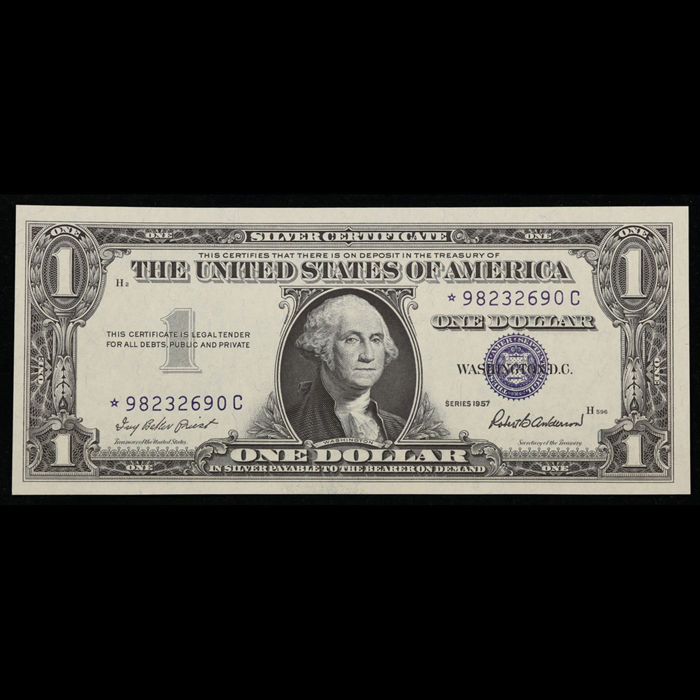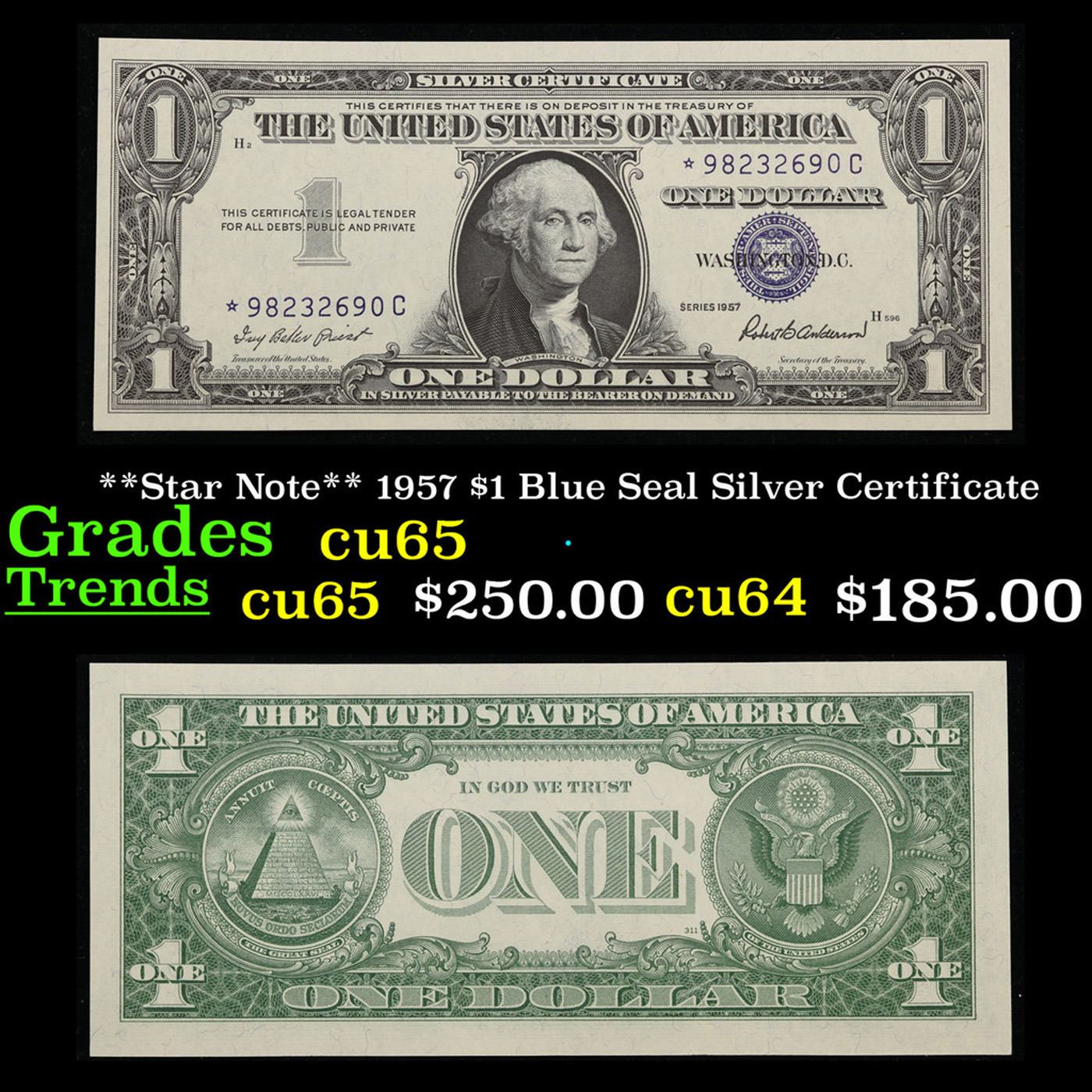 **Star Note** 1957 $1 Blue Seal Silver Certificate Grades Gem CU. When a currency note is deemed imperfect in its manufacture, it is replaced with a Star Note which bears a star before or after the serial number. Star Notes are scarcer than regular issues, as only a limited number are produced and fewer still are placed in circulation. Silver Certificates, and in particular Star Note issues, are among the most sought-after U.S. currency notes.